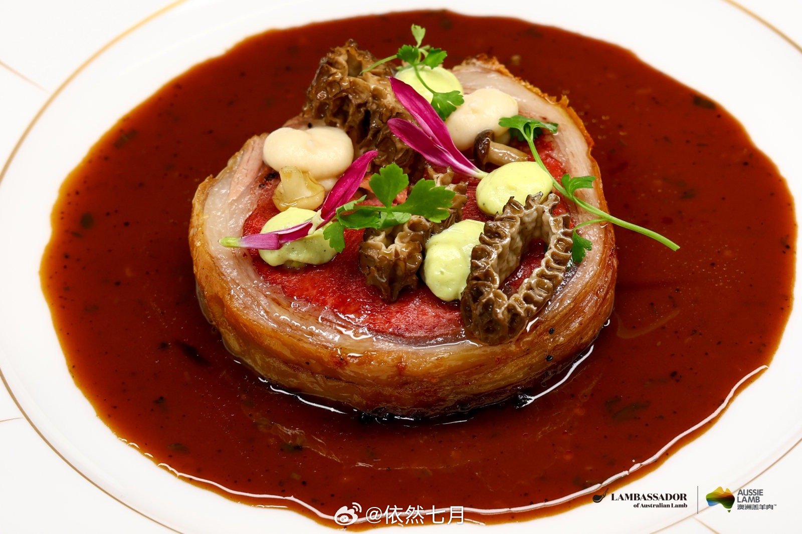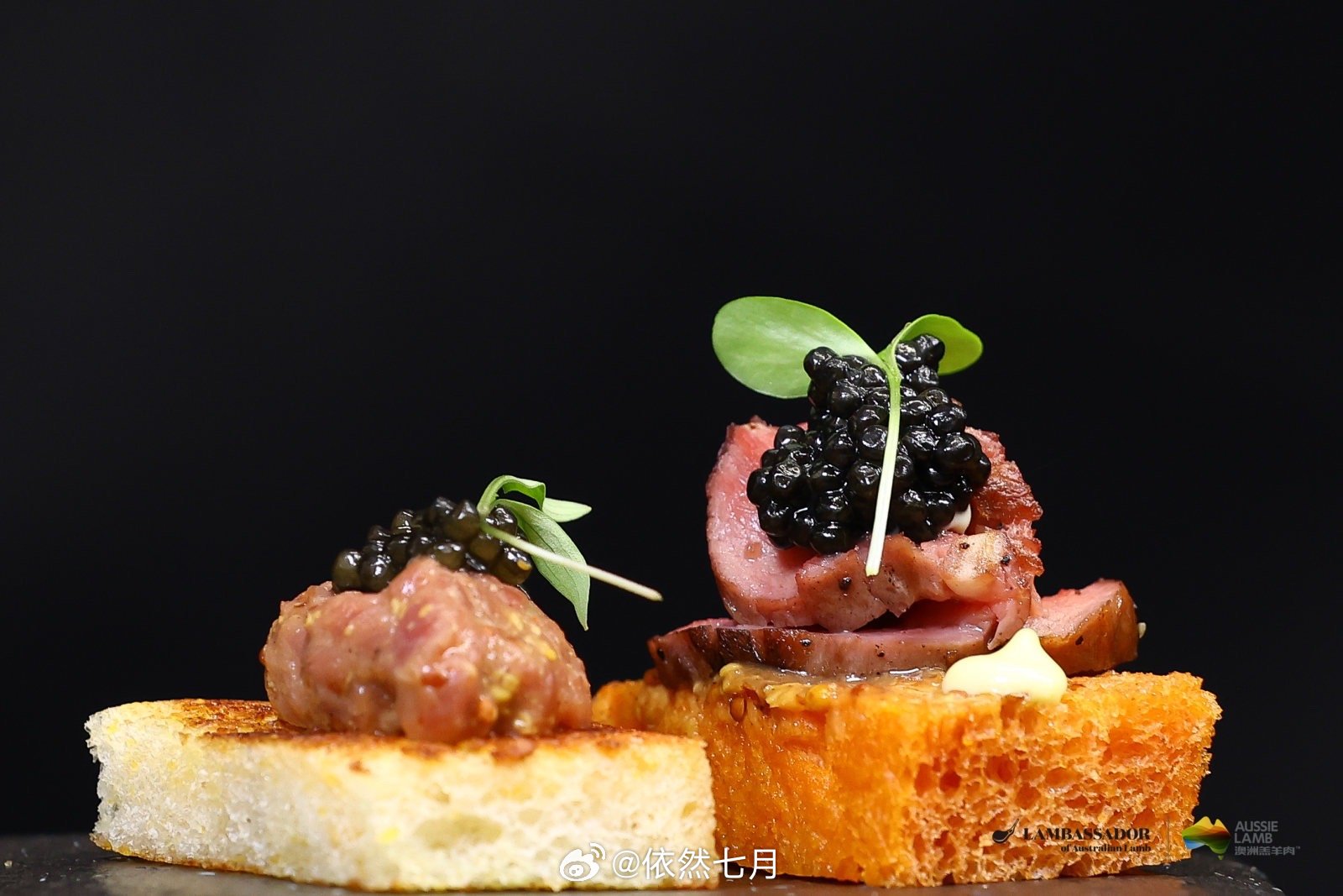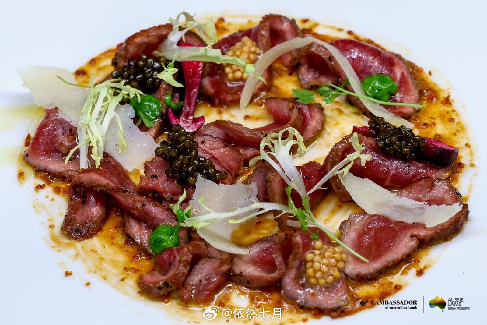 澳洲羔羊肉薄片,羊里脊,生食料理突出了澳洲羊肉的细腻嫩滑,搭配鱼子酱、薄荷冻、奶酪、芥末酱,层次丰富跳跃,让澳洲羊肉的鲜甜跃然舌尖。