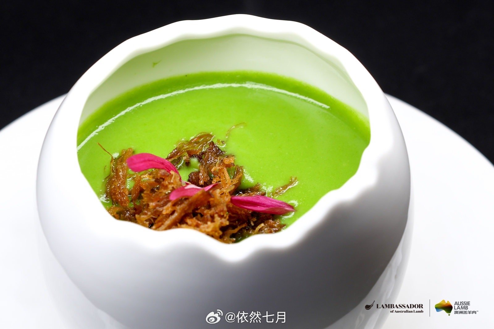 青豆汤与慢炖羊肩肉,饱含汤汁的肉丝搭配清爽细腻的青豆汤,有烟熏辣椒调味,美味妙不可言。