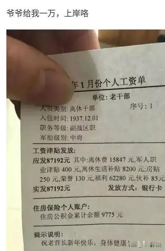 公平不公平咱不知道,差距是真的大啊~有人一身铁锈月入100大元,有人光芒万丈年入百万[赞]咱有图有真相,不信你往下看~ 对比图1图2和图3图4,是不是就不用我多说啥了?但是吧,我觉得咱们也不能只看当前人家拿得多就情绪激动的高喊不公平,咱是不是也得看看人家曾经的付出和贡献?这样才客观吧? 话说回来,这世界本就有人在高楼,有人在深沟,有人光芒万丈,有人光芒万丈,有人一身铁锈。我们不是看见别人家退休金就闭着眼喊不公平。很多高退休金人群,是人家年轻时付出和贡献的回报。人家拿这个数,我们不光心服口服,还打心里祝福老人家健康长寿! 让我们感到无(不)力(公)的是另外一种高退休金人群,他们凭借出身等"先天优势",就在我们常人穷其一生也难以望其项背的圈子里,轻松实现“几代人薪火相传”。这种情形,才是让我们觉得不公的本因吧~ #退休金差距大,公平吗#