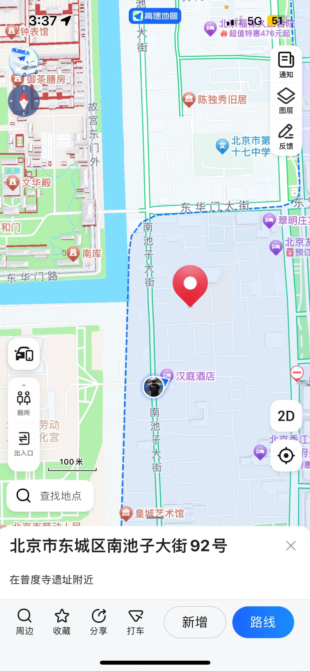 1、可以选择南池子大街的汉庭酒店,由这里出发徒步去广场大概是10-15分钟,大概800米。