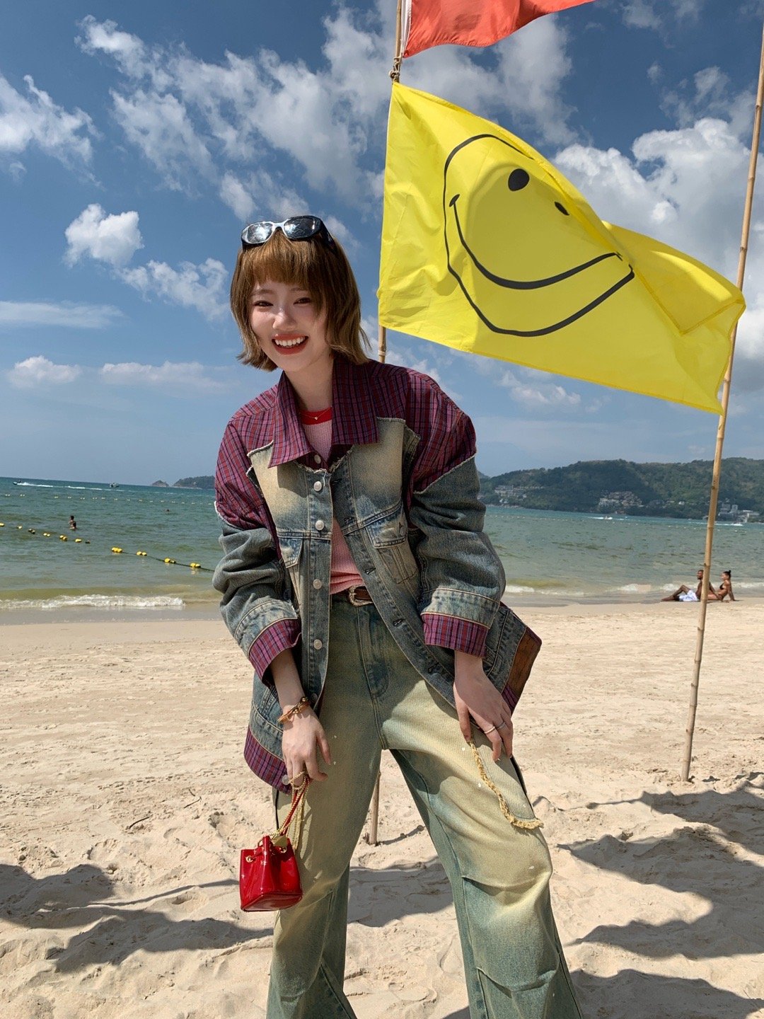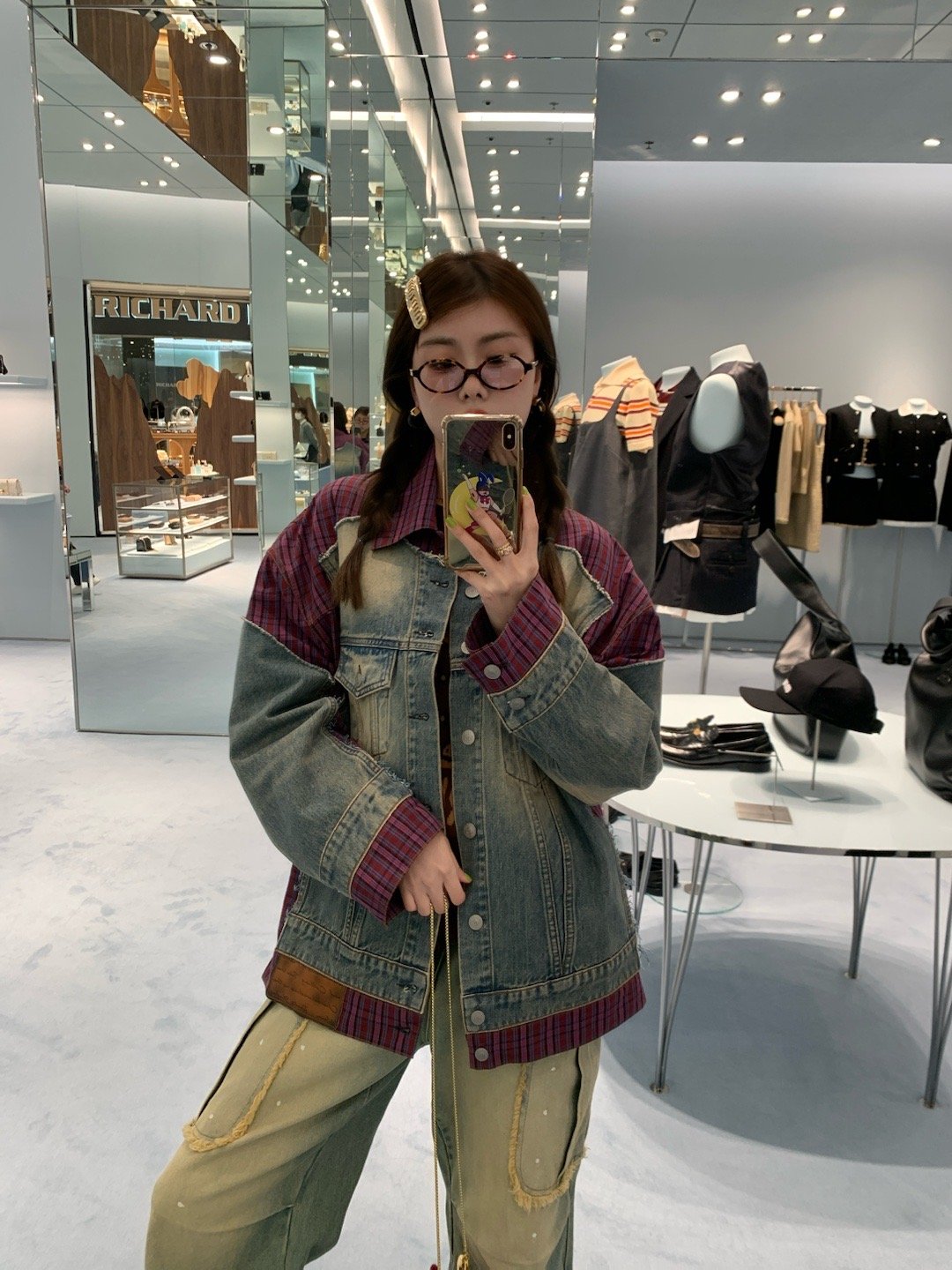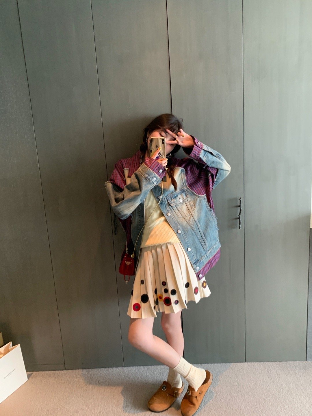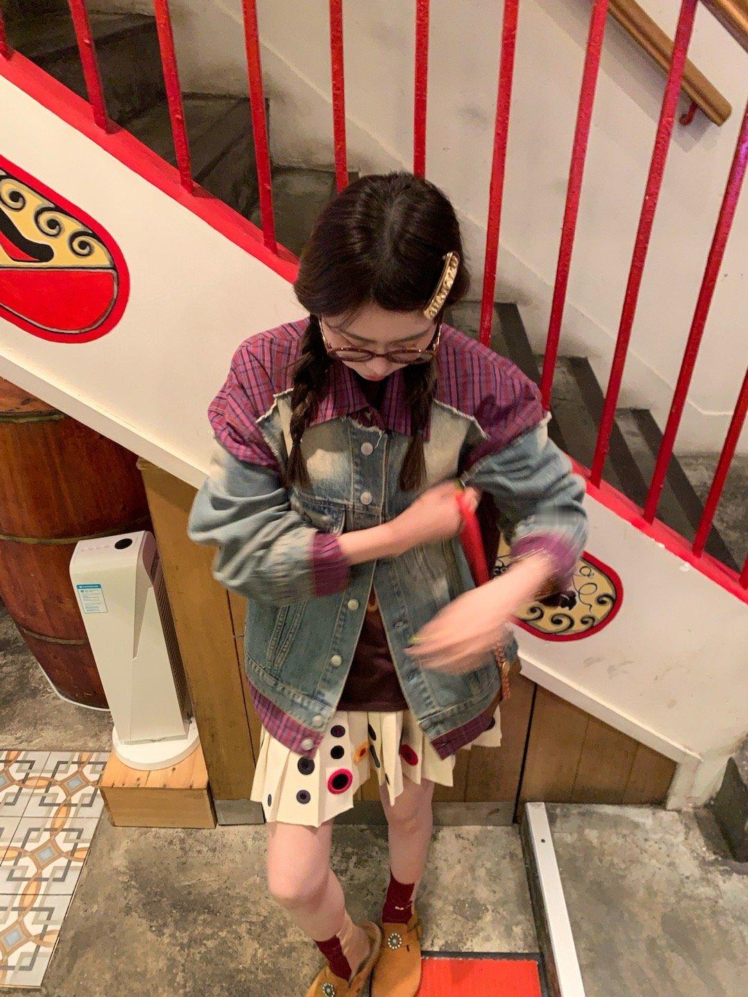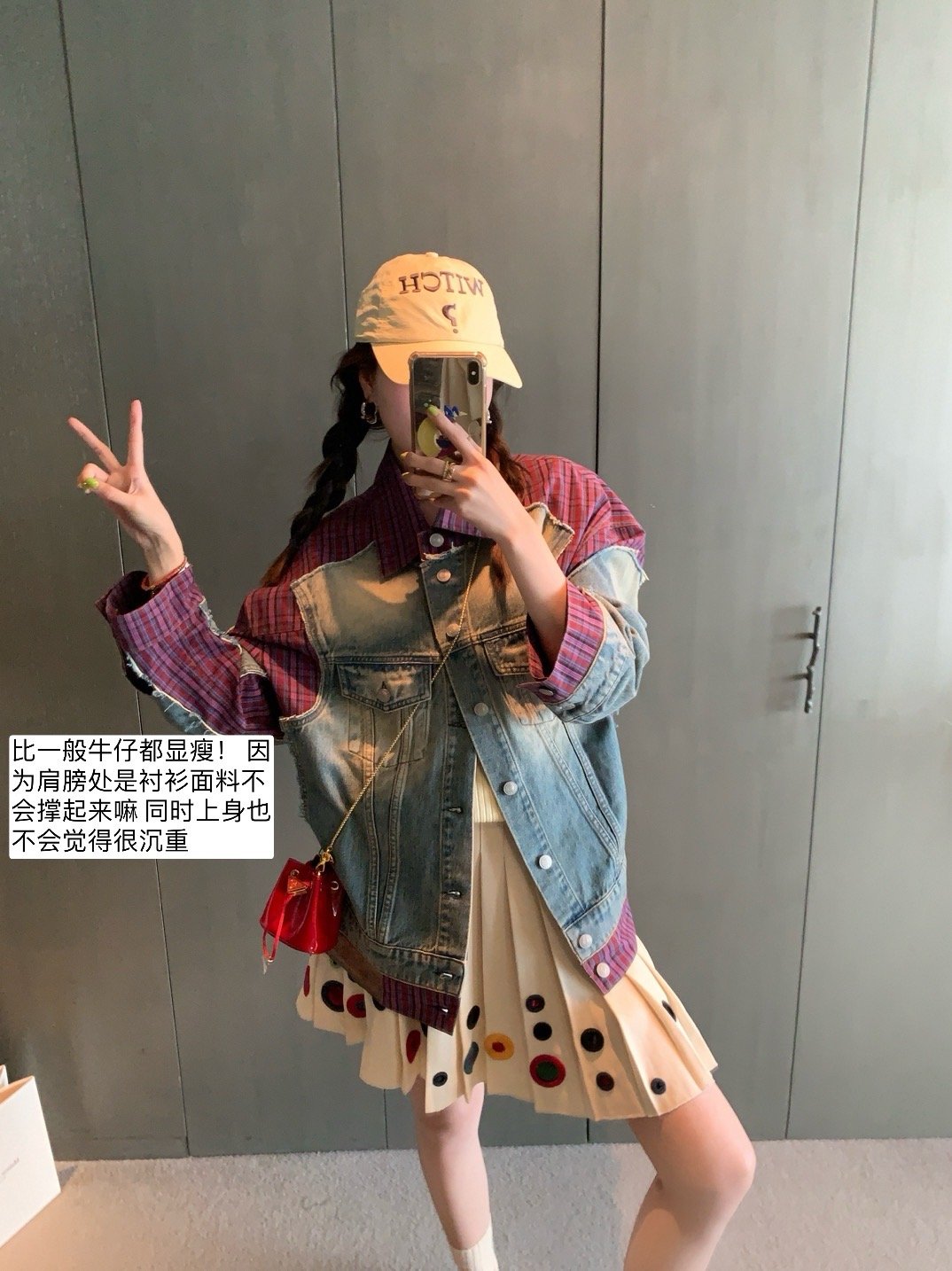 紫色格子衬衫部份是定制的 特别显白 有种清冷感 比普通牛仔衣更时髦特别 穿起来就很有自己风格的那种! 滑5张50无门槛噜