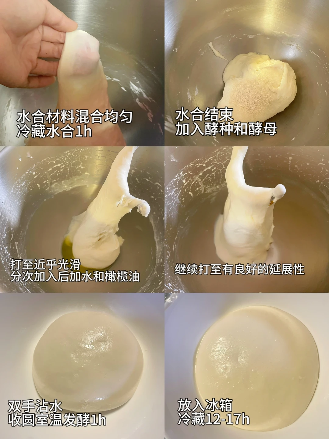 1⃣️水解面团材料混合均匀无结块,室温15度以下室温水解1h(高于15放冰箱)
