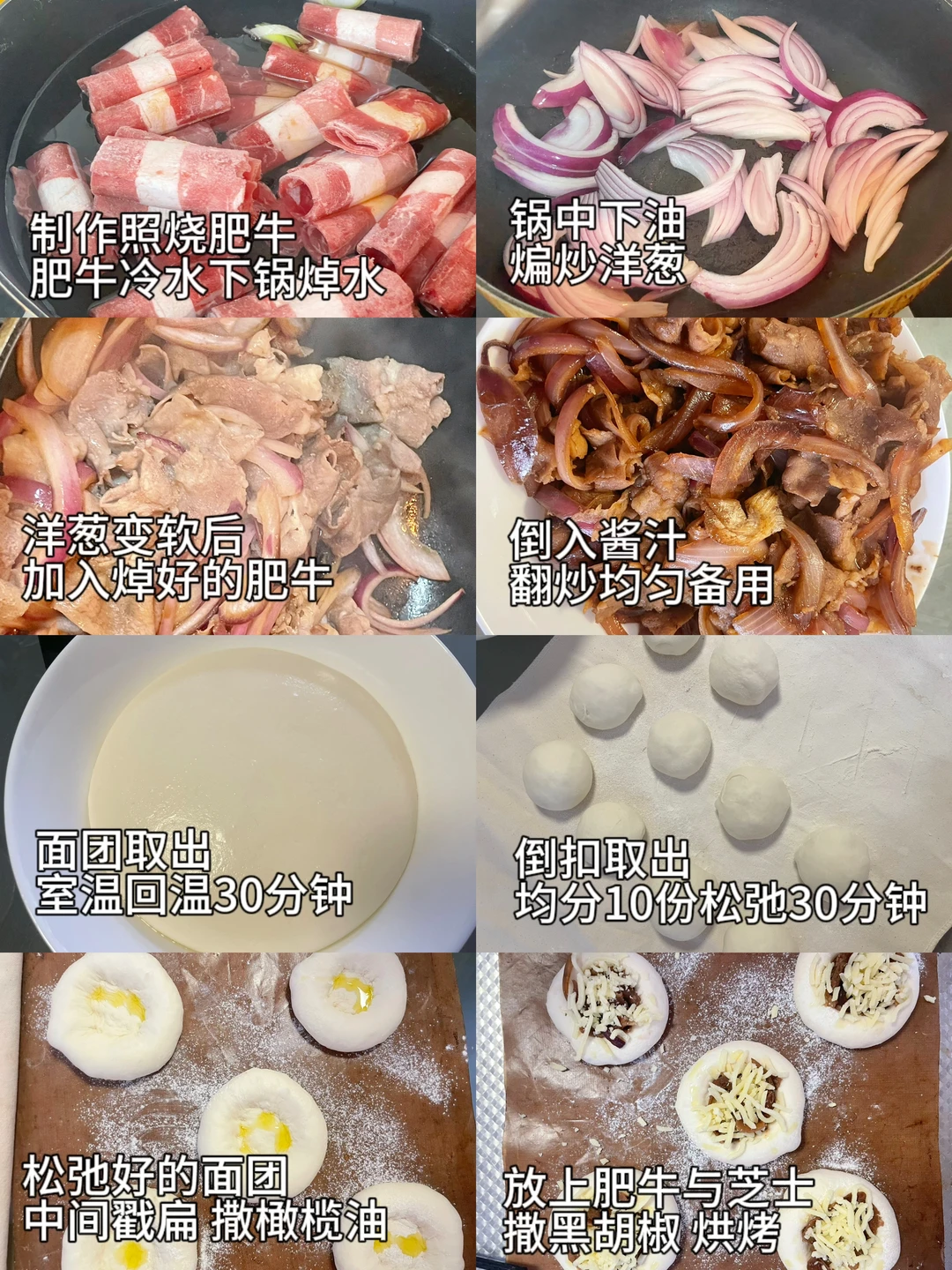 5⃣️松弛好的面团中心一圈摁扁,涂抹一点橄榄,放入照烧肥牛,撒上黑胡椒海盐和马苏里拉芝士