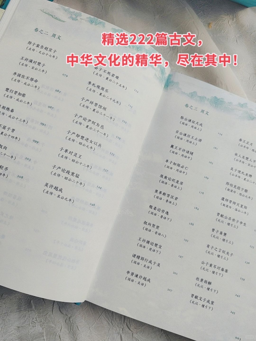 《古文观止》全书共分为十二卷,收录东周至明末的222篇散文,其中包括《左传》34篇、《战国策》14篇、《国语》11篇……都是对后世有着深远影响的精华文章!