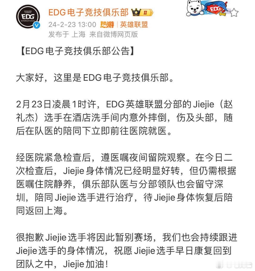 #jiejie摔倒##EDG官宣Jiejie暂别赛场##jiejie受伤暂别赛场#