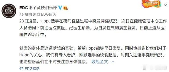 2020年夏季赛,当时还在为EDG效力的Hope选手,在6月23号的凌晨直播过程中突发胸痛状况,次日在健康管理中心工作人员陪同下前往医院就医。经医生诊断,为自发性气胸病症复发,后续遵从医嘱住院治疗。