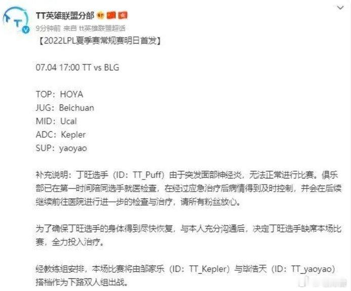 2022年LPL夏季赛,TT对阵BLG赛前,TT官方发文称下路选手Puff因为突发面部神经炎,无法正常进行比赛,俱乐部已经在第一时间陪选手进行就医检查。