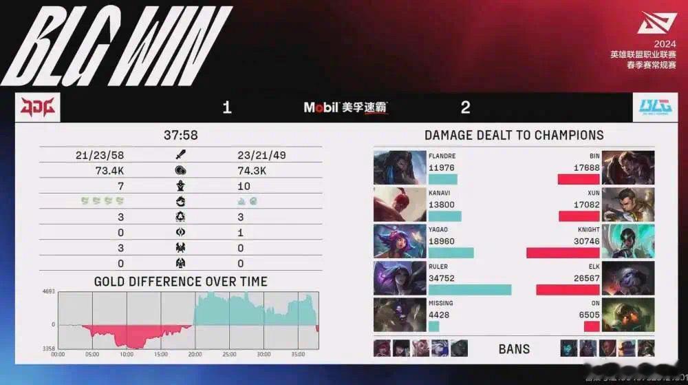 后期BLG战队打大龙,岩雀大招封路却把自己送掉,使得JDG战队反拿远古龙。随后BLG战队抓卡牌被大招逃了,JDG战队趁机入侵野区想搞事。此时JDG明烛突然被女警闪现两枪点掉,其他三人冲动追击又被反打,套着远古龙BUFF仍被碾压团灭,BLG战队赢下第一场比赛的胜利!