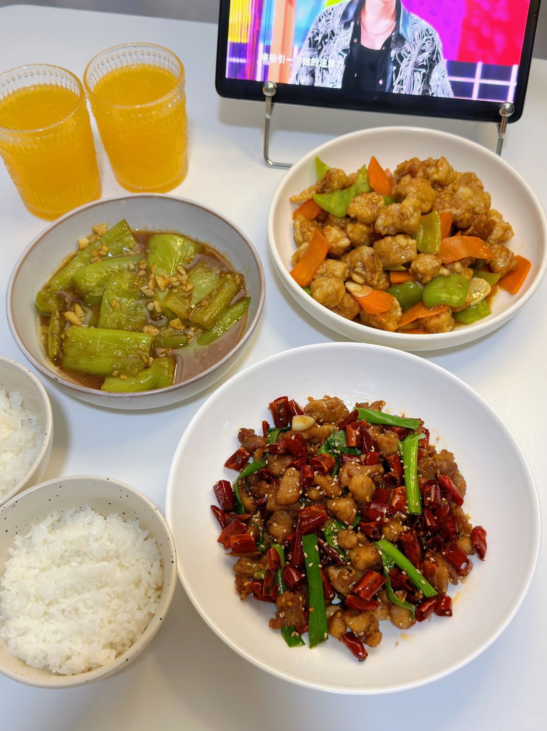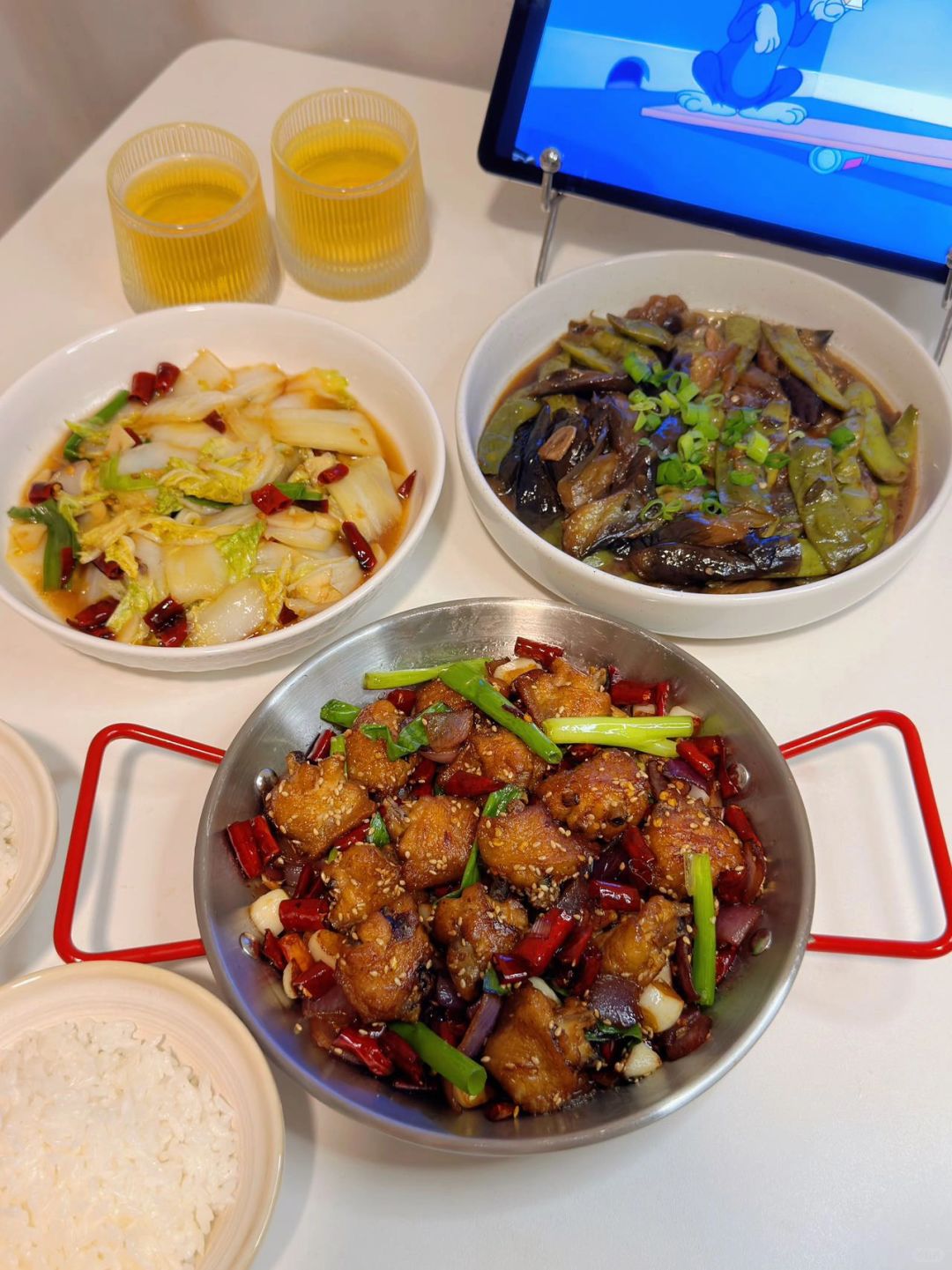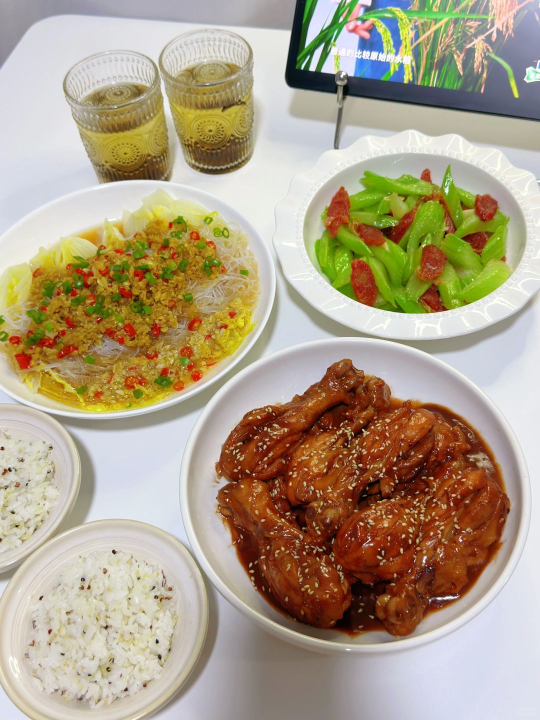 给大家整理了一周晚饭合集✨ 每道菜都有详细的教程🥘 希望能给大家带来做饭的灵感✨ 大家可以翻之前的笔记🎉 好好吃饭哟~💕💕 1️⃣辣子鸡丁➕溜肉段➕油焖尖椒 2️⃣ 红烧鸡翅➕西芹炒虾仁➕萝卜丝煎蛋汤 3️⃣辣子鸡翅➕酸辣白菜➕油豆烧茄子 4️⃣红烧鸡块➕油焖尖椒➕紫菜蛋花汤 5️⃣叉烧鸡腿➕西芹炒腊肠➕蒜蓉粉丝娃娃菜 6️⃣ 话梅排骨➕青椒土豆丝➕白灼西兰花 7️⃣蒜香黄油鸡翅➕干锅藕片➕蒜蓉菊花菜