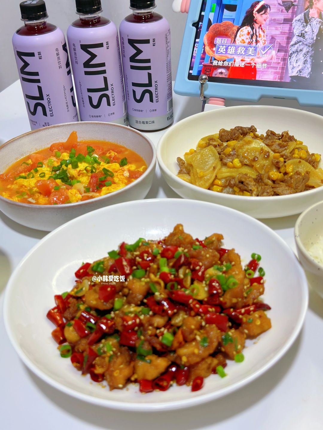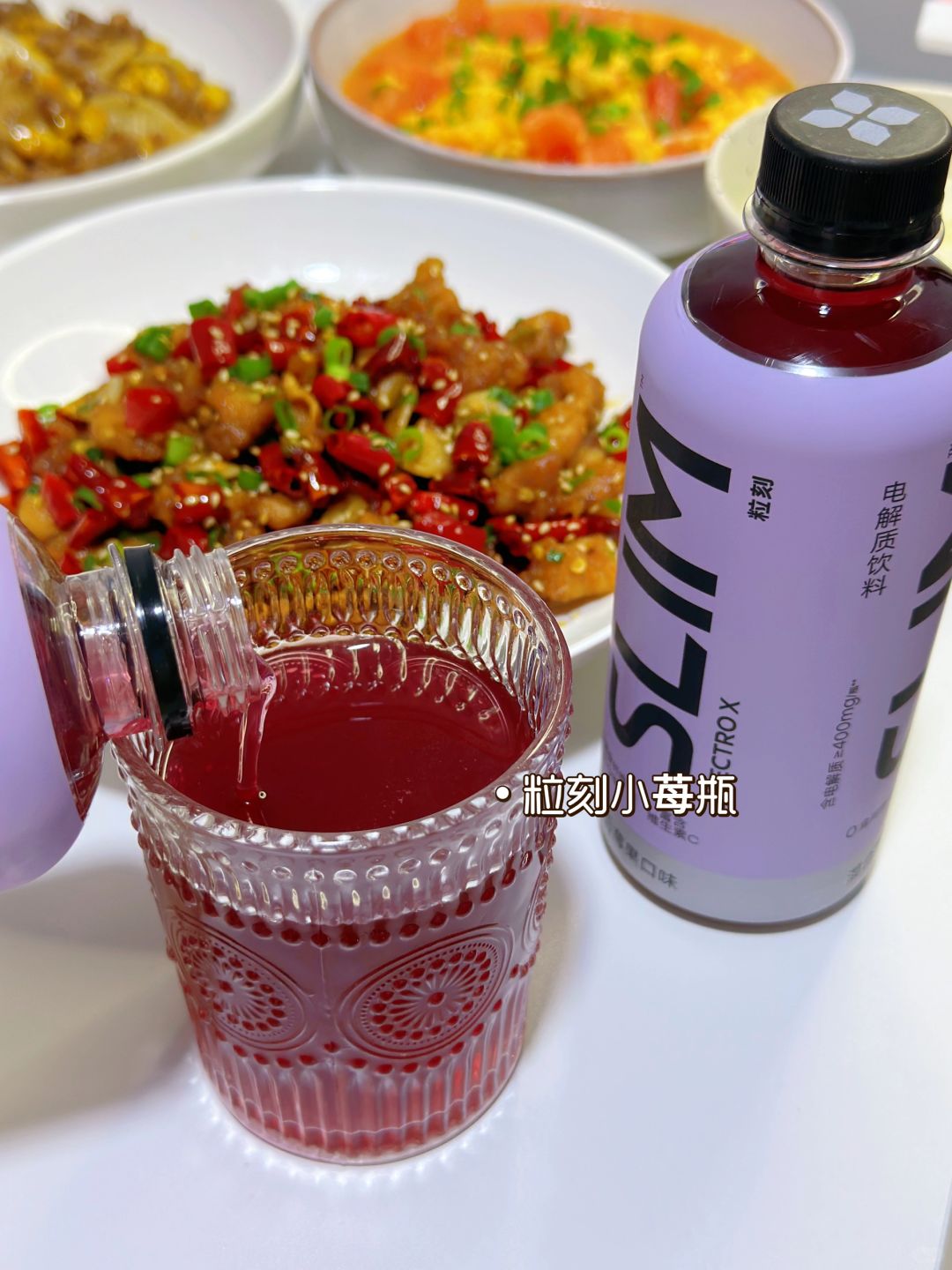 🎊辣子鸡丁麻麻辣辣的太下饭了!还有萝卜炒牛肉,玉米粒的甜香和牛肉碰撞出了不一样的口感~ 🌈今日菜单: 1️⃣辣子鸡丁 2️⃣萝卜炒牛肉 3️⃣西红柿炒鸡蛋 4️⃣酸酸甜甜莓果饮料 🎊zui近真是爱了这款🔍粒刻小苺瓶!每瓶的膳食纤维含量相当于33颗西梅,太适合当佐餐饮品了。刚好春节刚过,需要进行身材管理,这个无糖又低卡,简直是完美的减脂伴侣。🍅里面还有很多VC、电解质,紫色的液体看着就让人喜欢,入口酸酸甜甜,是蓝莓草莓混合的新鲜莓果汁的口感,每次聚餐或者大鱼大肉时我都会来一瓶,根本喝不够~