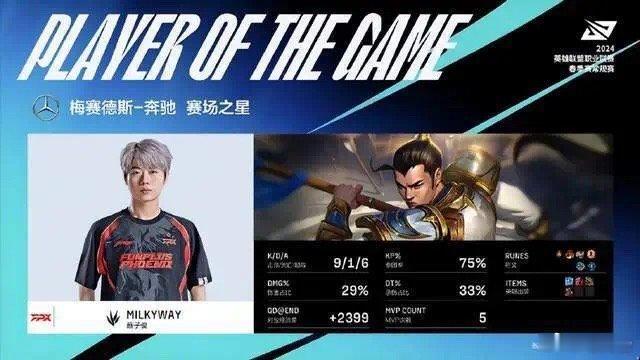 在第一局比赛milkyway就选出破败王这个比较少见的非常规打野,在前中期取得了不错的效果,但是由于下路Deokdam和Life拿了一套熟练度较低的组合,在中期运营和团战时连连失误,导致FPX输掉了比赛。不过随后两局FPX调整了BP策略并完成让一追二,在第二局milkyway拿到版本强势的打野赵信,9-1-6的完美数据率队扳平比分。