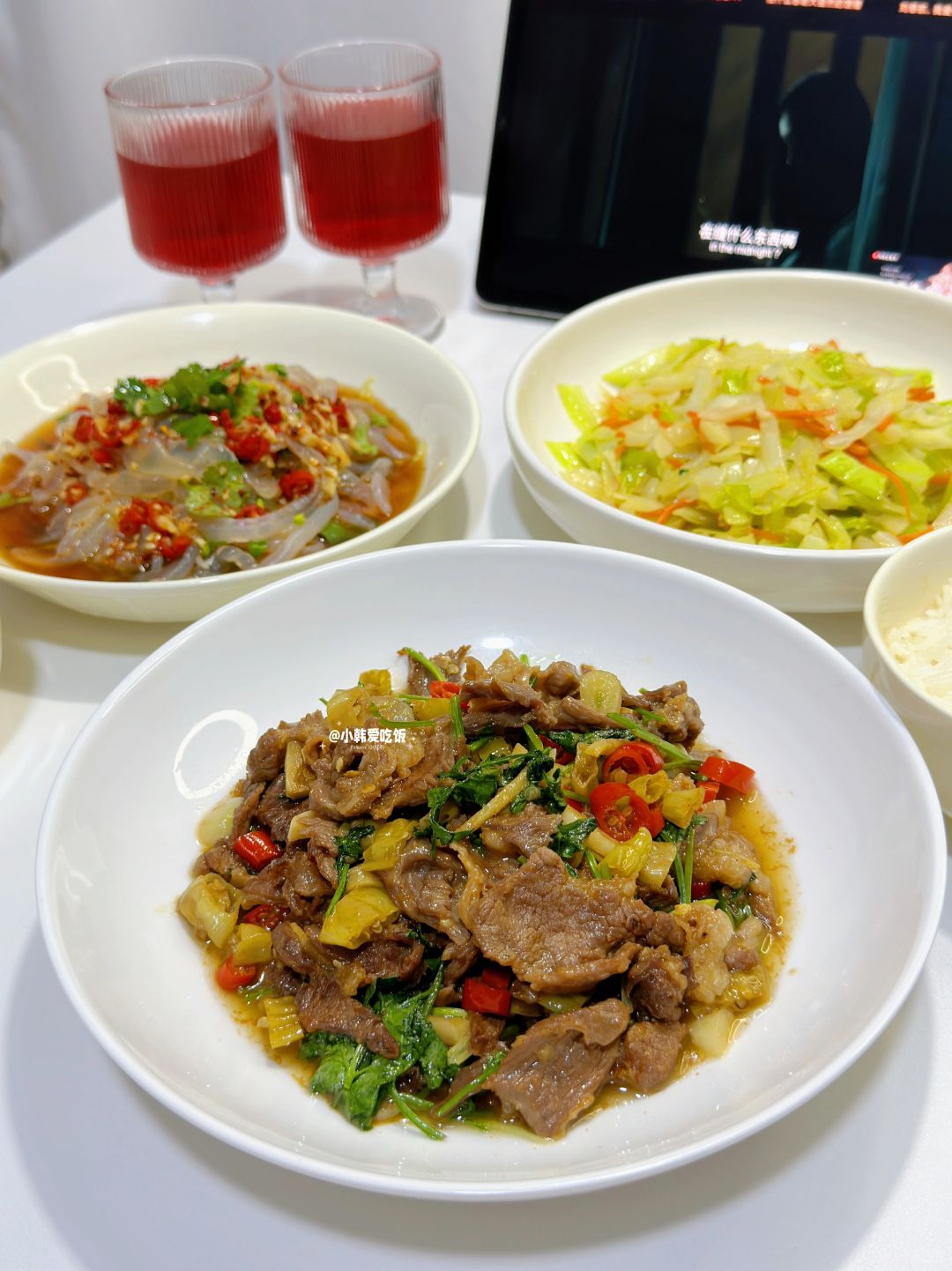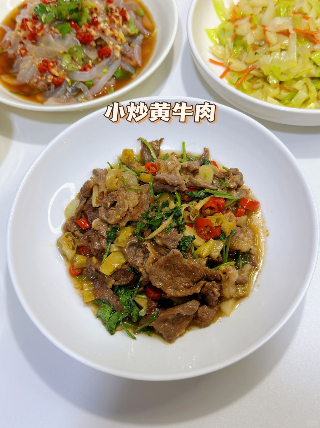 🎊小炒黄牛肉太好吃啦!酸酸辣辣的太下饭了吧!还有包菜脆脆甜甜的好喜欢~ 🌈今日菜单: 1️⃣小炒黄牛肉 2️⃣清炒包菜 3️⃣凉拌海蜇丝