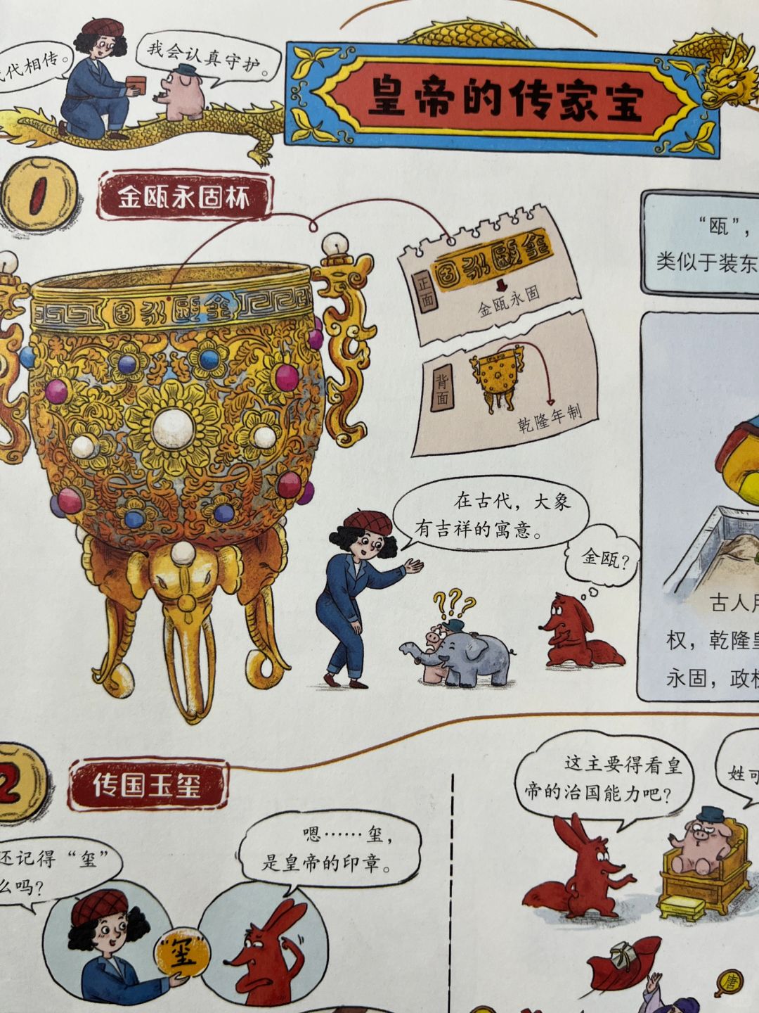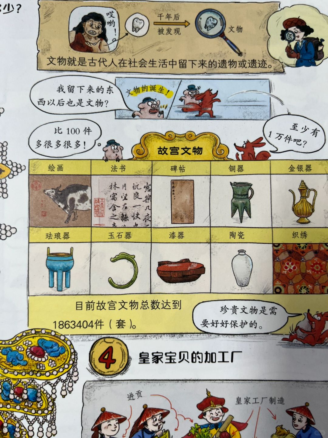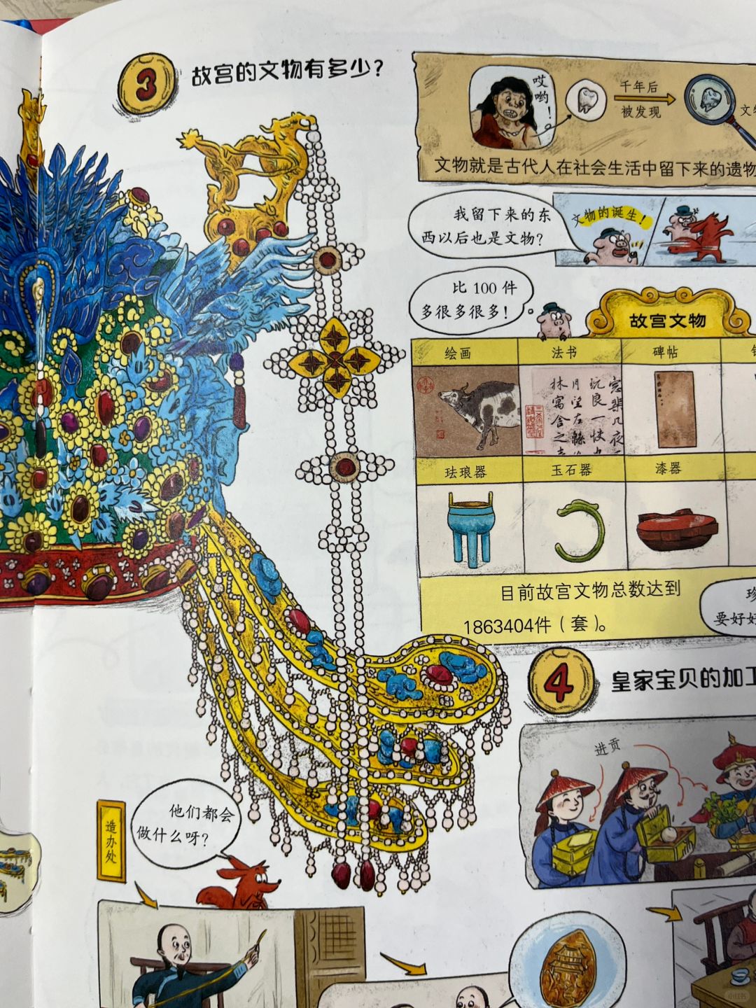 我最喜欢的还是关于故宫文物这一本。故宫里的宝贝可不少,且稀世珍品无数,光是看着这些璀璨夺目的文物图片,就是一种享受。目前故宫文物总数有180多万件(套)。就皇帝穿的龙袍,采用最好的布料——云锦织成,一个绣工一天只能织5厘米。据记载,做一件龙袍,要26个画匠、608个绣工,还有285个人做辅助工作,两三年才能完工。