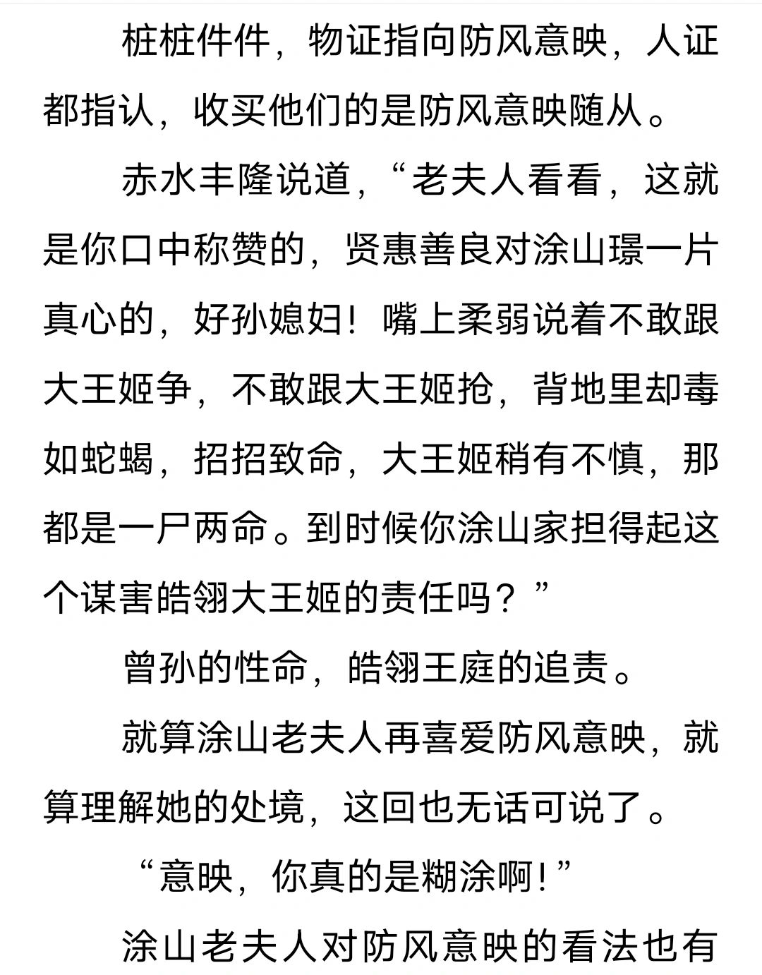 赤水丰隆说道,“老夫人看看,这就是你口中称赞的,贤惠善良对涂山璟一片真心的,好孙媳妇!嘴上柔弱说着不敢跟大王姬争,不敢跟大王姬抢,背地里却毒如蛇蝎,招招致命,大王姬稍有不慎,那都是一尸两命。到时候你涂山家担得起这个谋害皓翎大王姬的责任吗?”