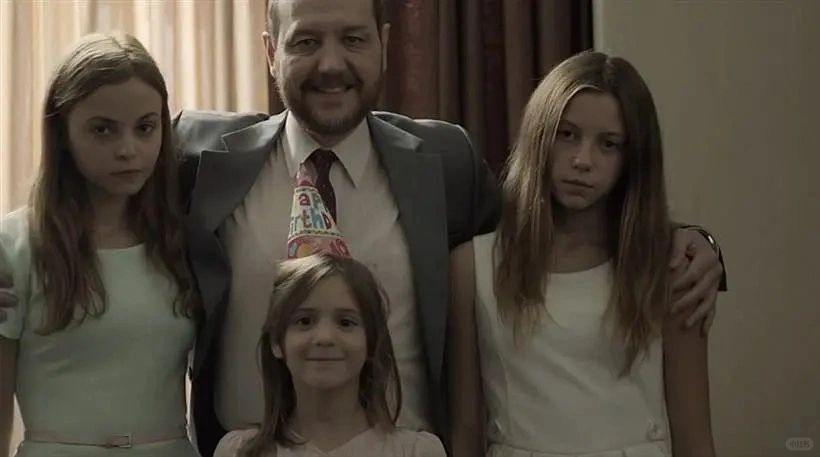 这是表现上看氛围十分融洽,但每个人脸上都写着麻木的一家人,很显然,瑟米斯饰演的父亲在家中扮演着十分不可描述的地位,就连电视台播放的节目都是关于猴王的动物世界。