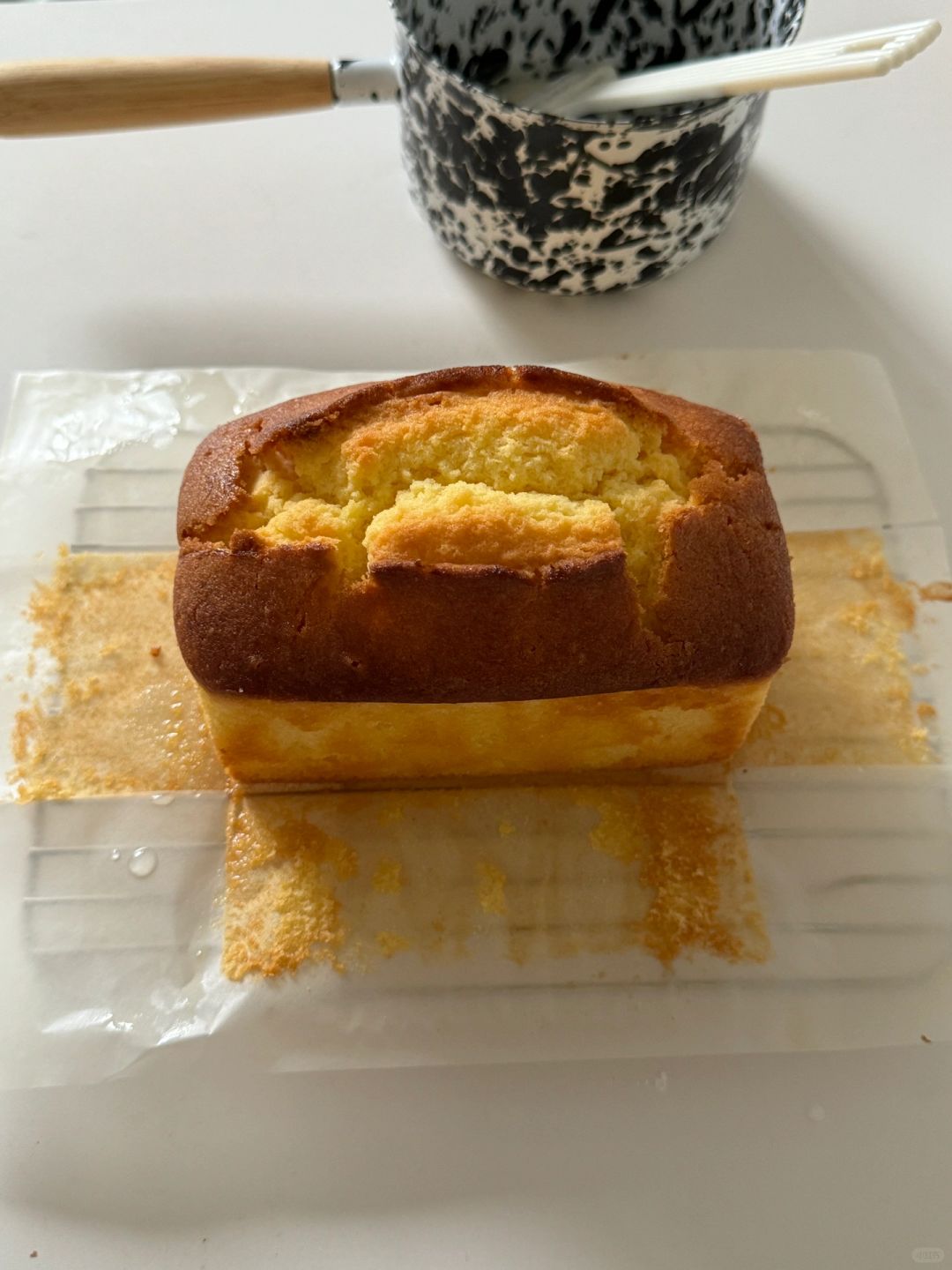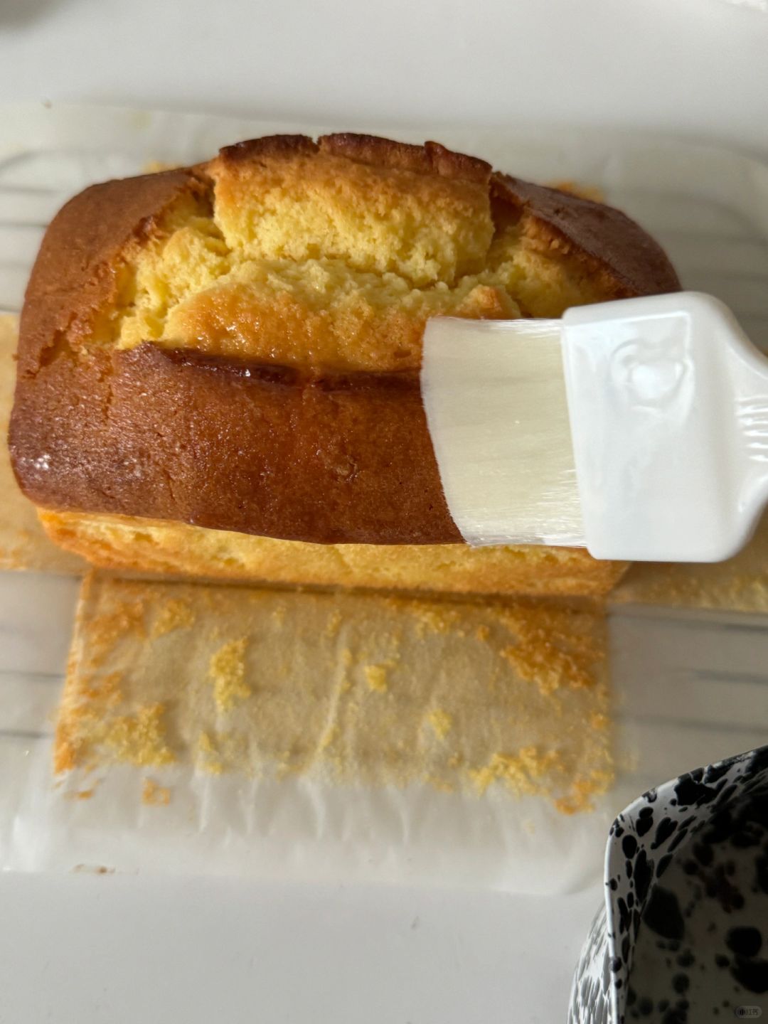烤好震一下取出磅蛋糕,四周表面刷上柠檬糖水