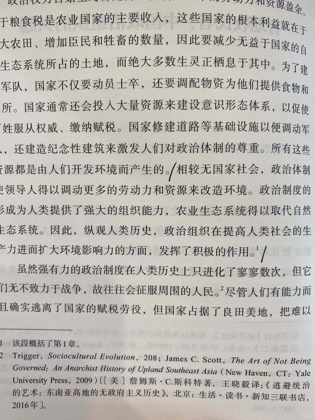 农业的发展使得人类产出的食物和资源盈余,可以供养非农业人口(工匠、士兵、文吏、官 僚等)于是在这种在大量农业人口食物与劳动力的供养下,政 治 体 制得以形成