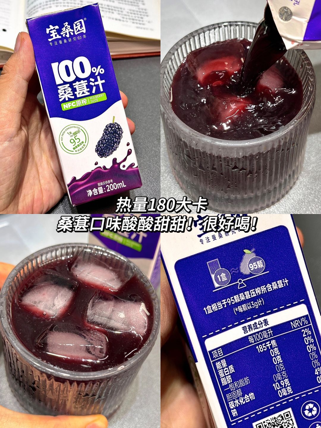 爱吃桑葚的姐妹看过来,这个桑葚汁是我在楼下超市盲买的,味道酸酸甜甜,0脂没有额外加糖,一瓶热量180大卡,不方便打果汁的姐妹可以试试这个