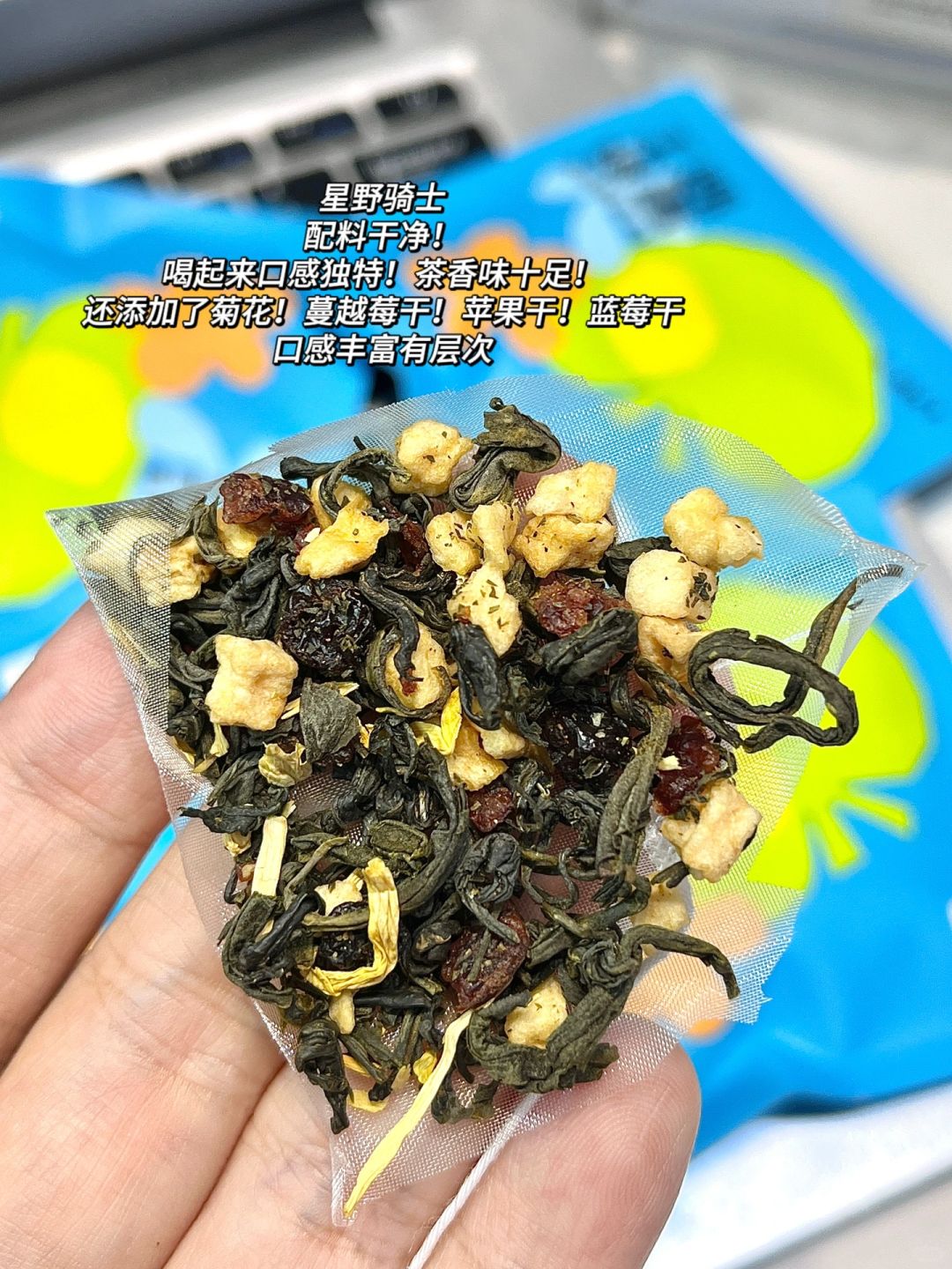 菊花、蔓越莓、苹果干、蓝莓干、各种水果干搭配绿茶的清香!喝起来非常浓郁丰富!不苦不涩很好喝