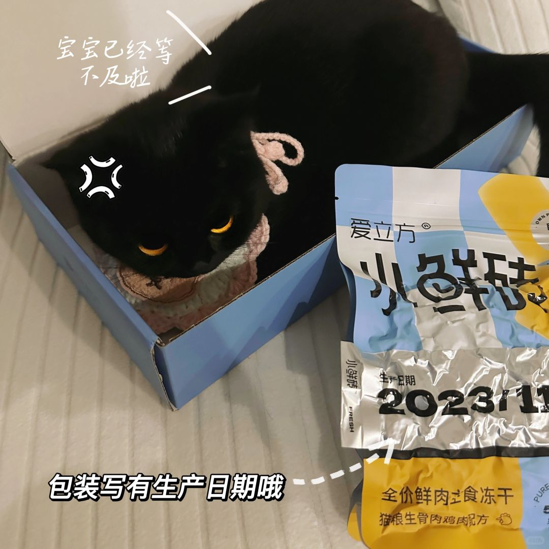 2️⃣关键词:鲜!🥰小鲜砖是纯鲜肉制作,收到手的生产日期还不到15天呐!到手后生产日期不超过十五天,还有双层锁鲜包装!人都喜欢吃新鲜的食物,更何况可爱的小猫咪呢!