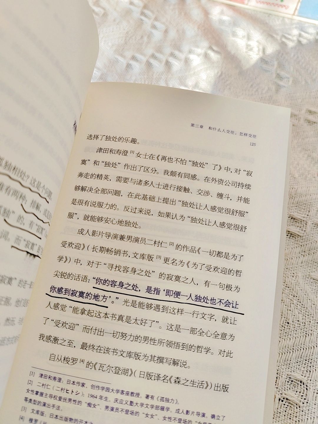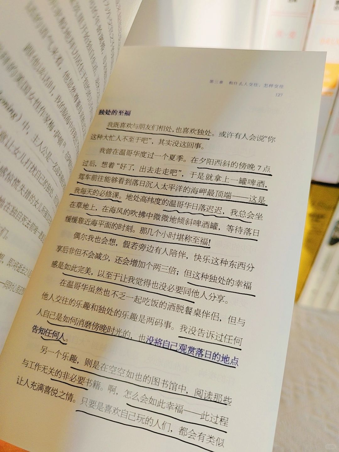 ❤️蕞喜欢的就是书中对于上野千鹤子独处时的描写:在夕阳西斜的傍晚7点过后,拿上一罐啤酒,驾车前往能够看到落日沉入太平洋的海岬蕞顶端……在空空如也的图书馆中阅读喜欢的书籍……在一次次亲近大自然中,感受自己的渺小……这是一股股强大的油然而生的幸福感,震颤着我的灵魂!