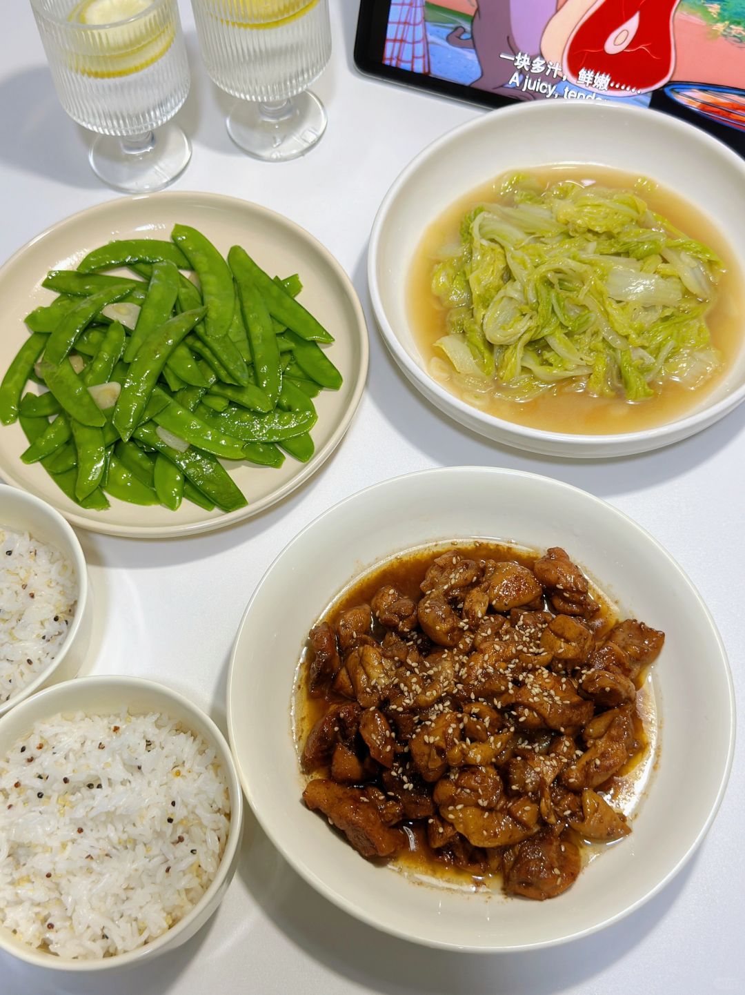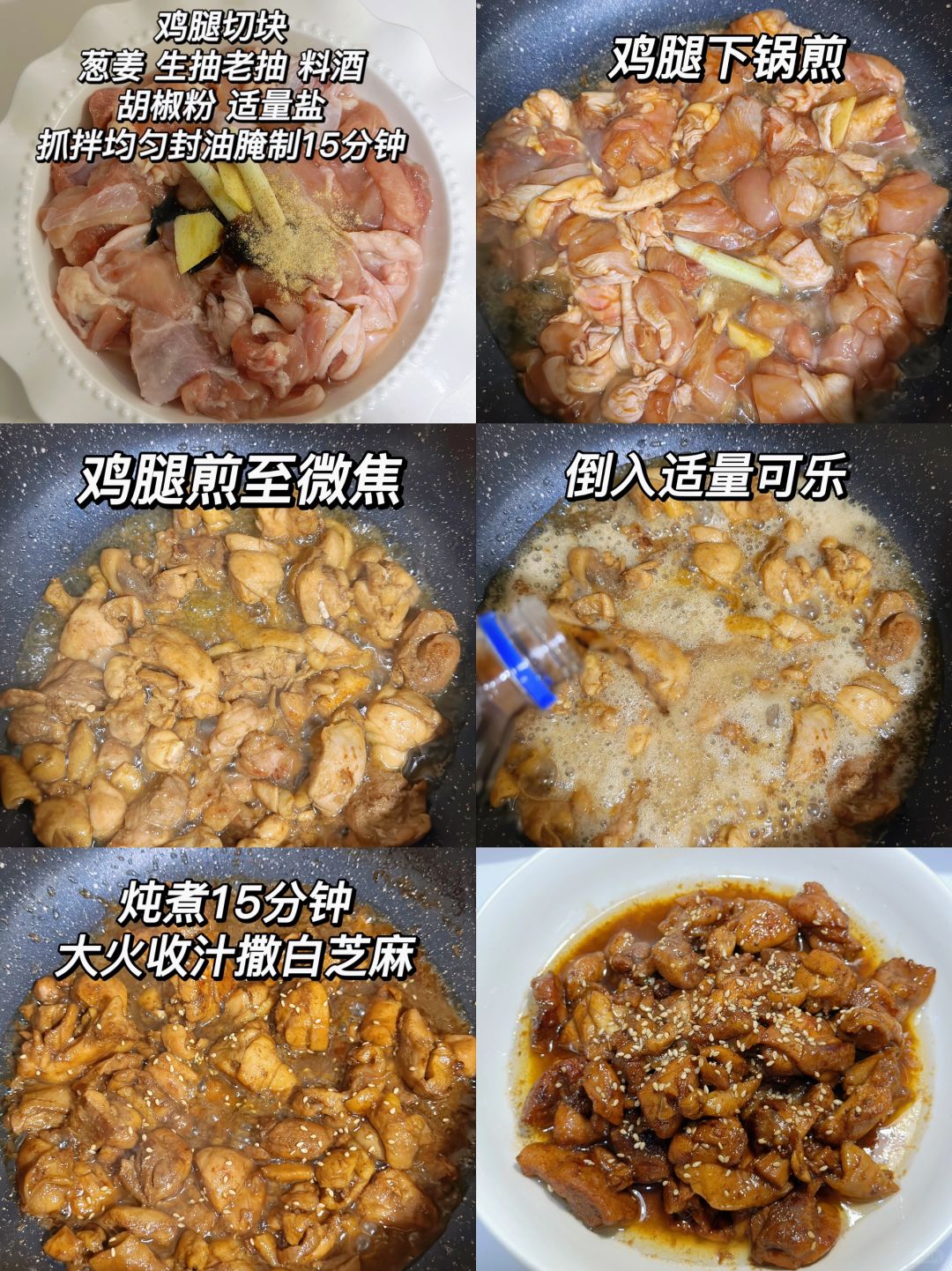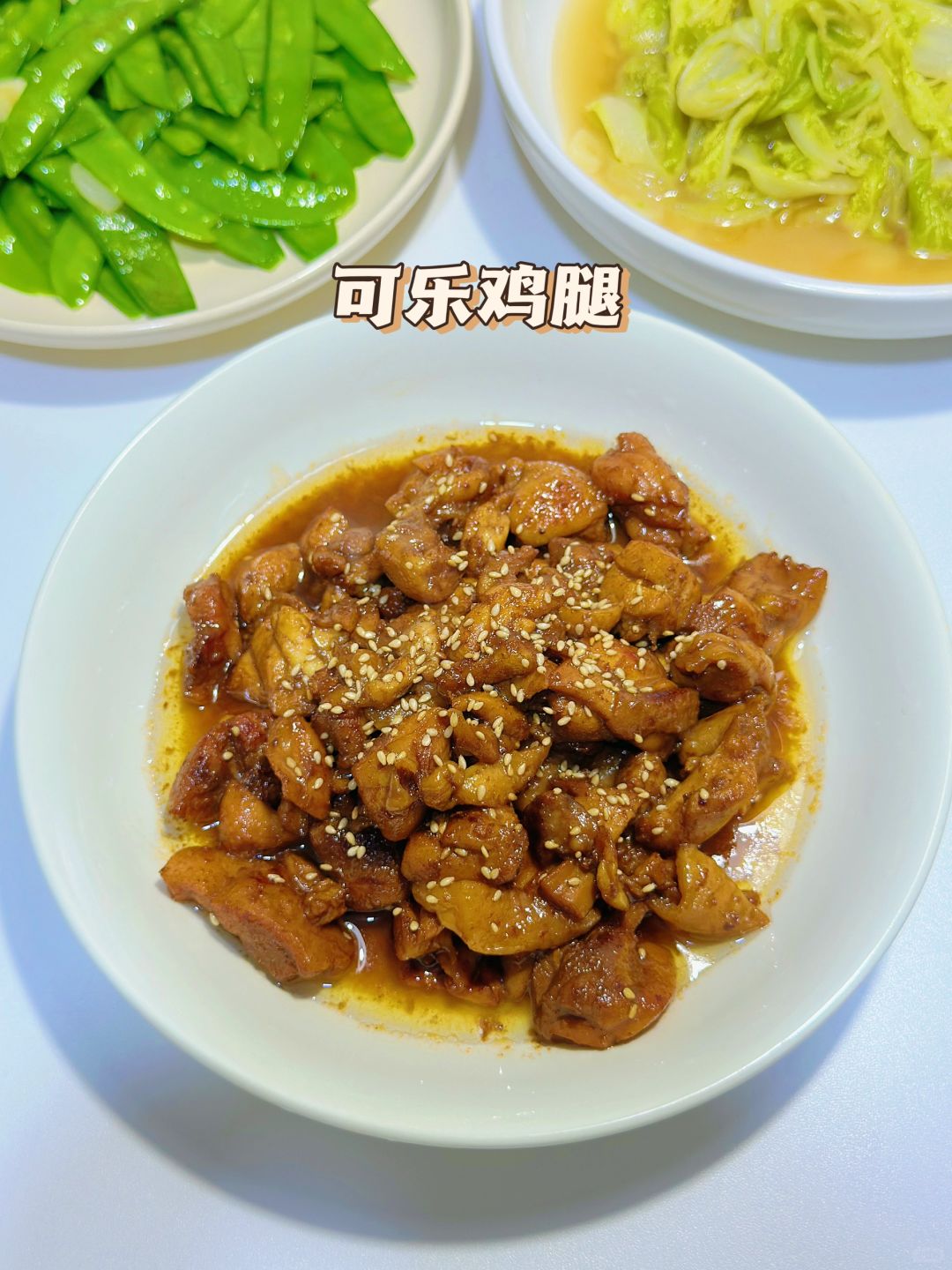 🎊今天的可乐鸡腿太下饭啦,太喜欢拌饭黏糊糊的口感了,白菜和荷兰豆清清甜甜的我好爱~ 🌈今日菜单: 1️⃣可乐鸡腿 鸡腿腌制15分钟,下锅煎至微焦,倒入适量可乐炖煮15分钟后大火收汁撒白芝麻装饰一下 2️⃣清炒白菜 蒜片炒香后,倒入白菜翻炒断生,蚝油生抽调味,加少许水炖煮5-8分钟 3️⃣清炒荷兰豆 荷兰豆焯水三分钟,蒜片炒香,倒入荷兰豆适量盐翻炒均匀即可