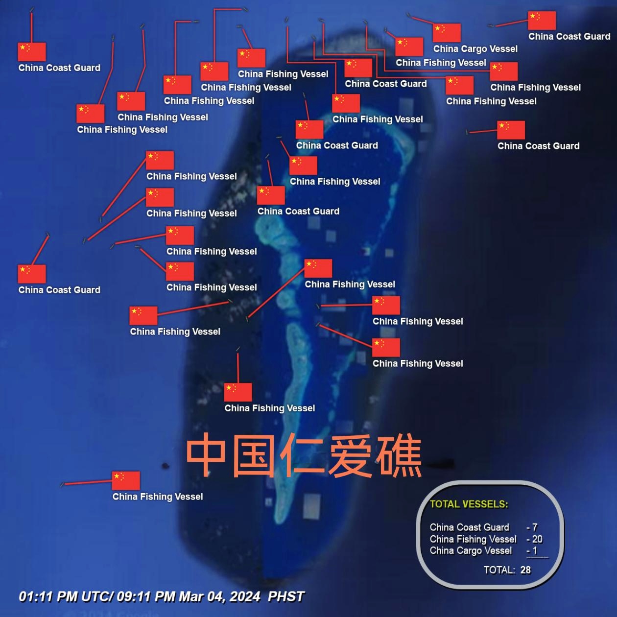 根据3月4日的最新船舶位置图显示,我南沙群岛仁爱礁邻近海域有中方的28艘各型船只,包括七艘海警船,21艘大型渔船和1艘物资补给船。