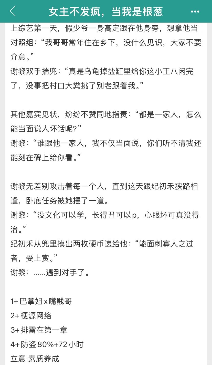 发疯沙雕文,除了梗还是梗。 女主从不精神内耗,虽然发着疯,但是闪着光。从不隐藏自己的爱,从不吝啬自己的温暖。虽然看上去毫无逻辑,但对朋友和亲人一直付出真心。 巴掌姐、嘴贱哥,天作之合。