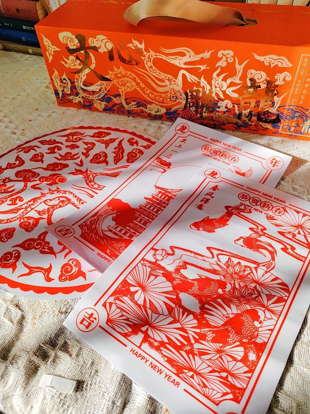矩形窗花图案及文字分别取自唐诗名篇。寓意豁达开阔,昂扬向上,祝福新的一年万事顺遂。圆形窗花龙纹为画像砖龙纹,与礼盒图案相呼应。