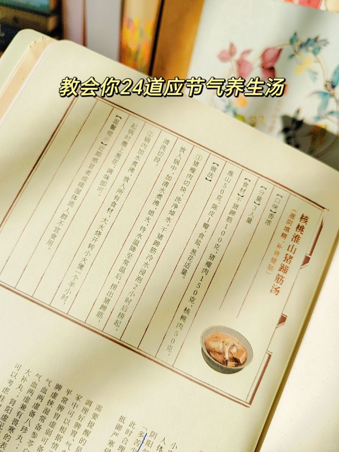 核桃淮山猪蹄筋汤、番茄洋葱羊骨汤、五指毛桃陈皮煲猪脊骨……详细的食谱,美味的味道,为你的健康保驾护航!!