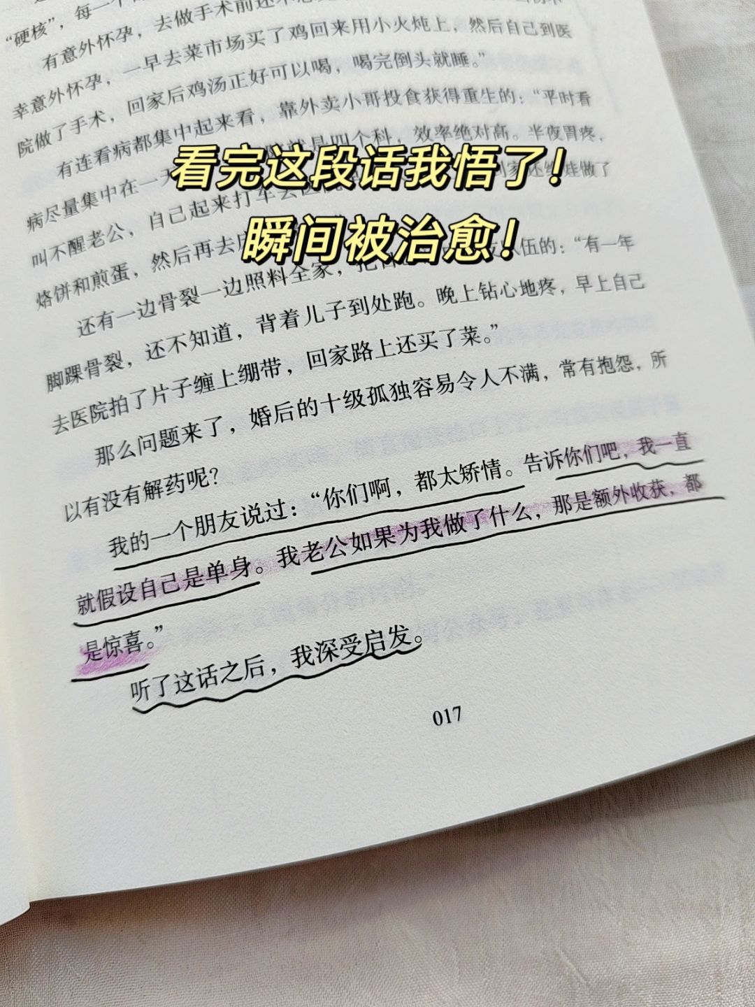 “我一直假设自己是单身,我老公如果为我做了什么,那是额外收获,都是惊喜!”(这个思维真让人豁然开朗!)