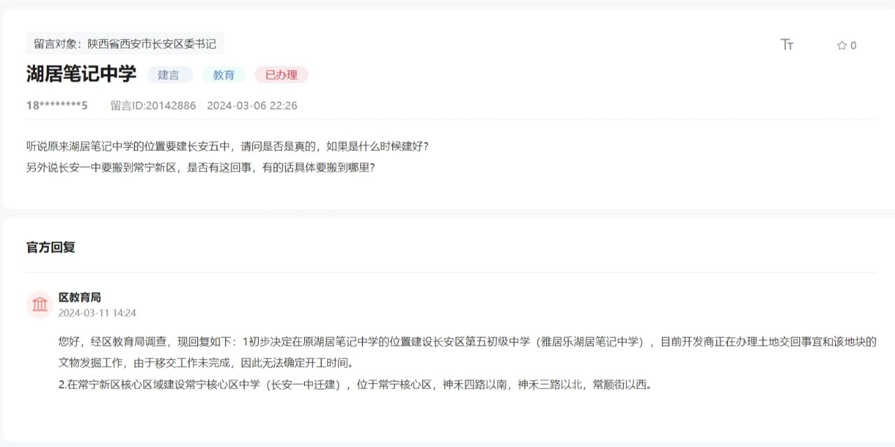 【老羊说楼市】长安一中要搬到常宁新区?雅居乐湖居笔记中学要新建长安区第五初级中学?3月11日官方证实了上述消息。 在长安区教育局的回复中,常宁新区核心区神禾四路以南、神禾三路以北、常顺街以西将建设常宁核心区中学,由长安一中迁建。 在原湖居笔记中学的位置建设长安区第五初级中学,目前开发商正在办理土地交回事宜和该地块的文物发掘工作,因移交工作未完成,无法确定开工时间。