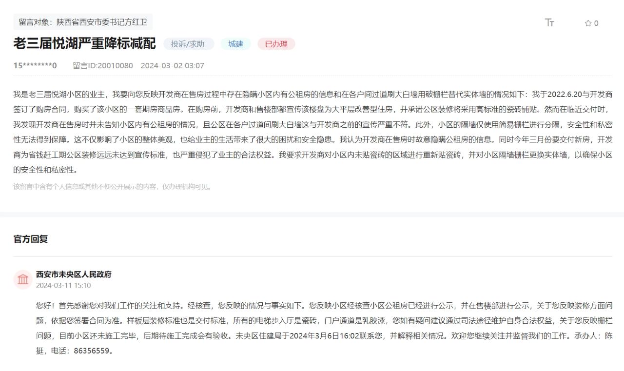 但在官方的回应中却表示,小区公租房进行了公示、在售楼部也有公示;样板层装修标准为交付标准、所有电梯步入厅是瓷砖,门户通道是乳胶漆;栅栏问题,小区还未施工完毕,待施工完毕会有验收。