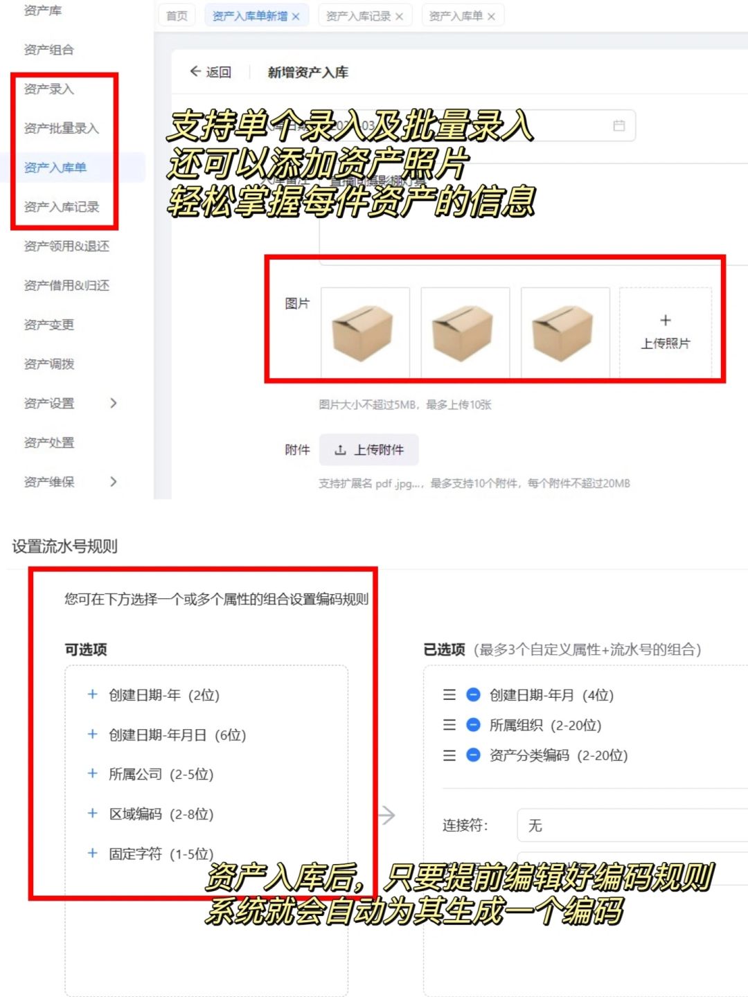 3⃣️资产入库后,只要提前编辑好编码规则,系统就会自动为其生成一个编码