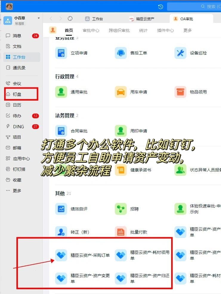 5⃣️精臣云资产不仅有网页版和APP,还与钉钉、企业微信或企业OA软件打通,无论是资产的领用、带出、变更,还是其他操作,均支持员工自助进行,免去行政部分工作