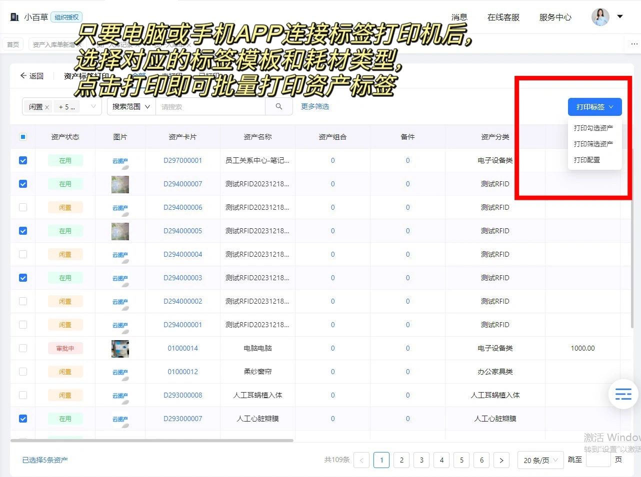 4⃣️只要电脑或手机APP连接标签打印机后,选择对应的标签模板和耗材类型,点击打印即可批量打印资产标签。