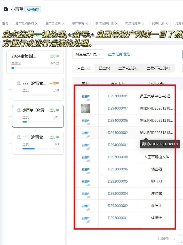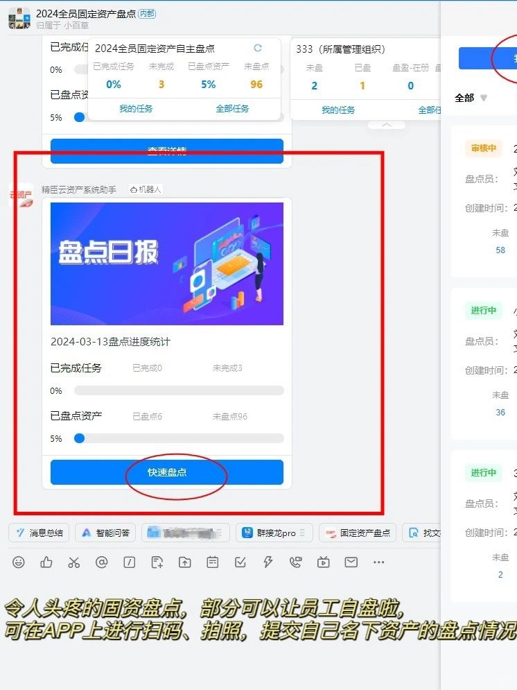 🔟盘点任务创建后,不用等盘点结束就可以随时在手机群内或者系统系统看进度,进度自动同步。盘亏、盘盈等资产列表一目了然,如果想查看其他的数据,也可以在后台随时查看报表
