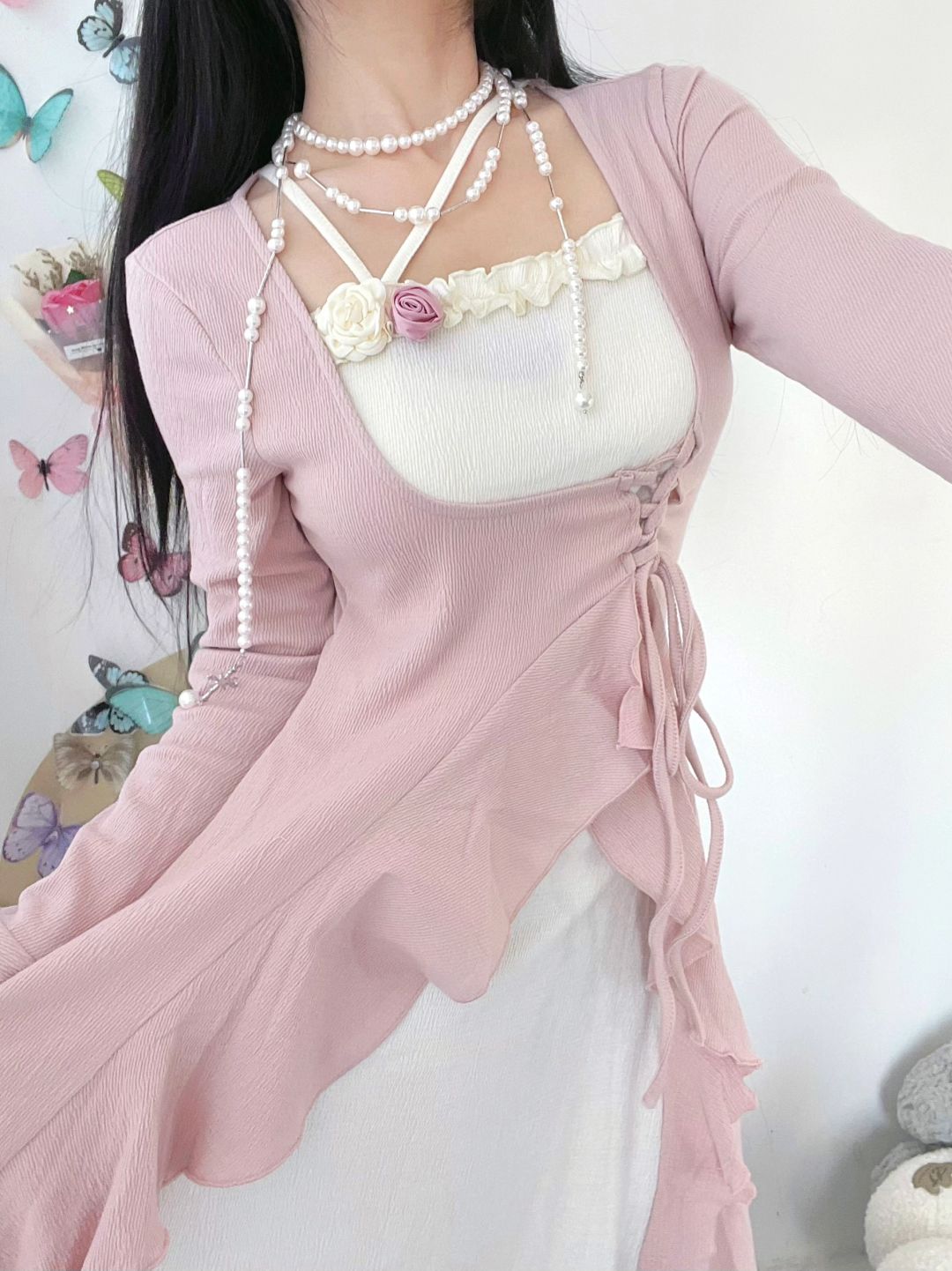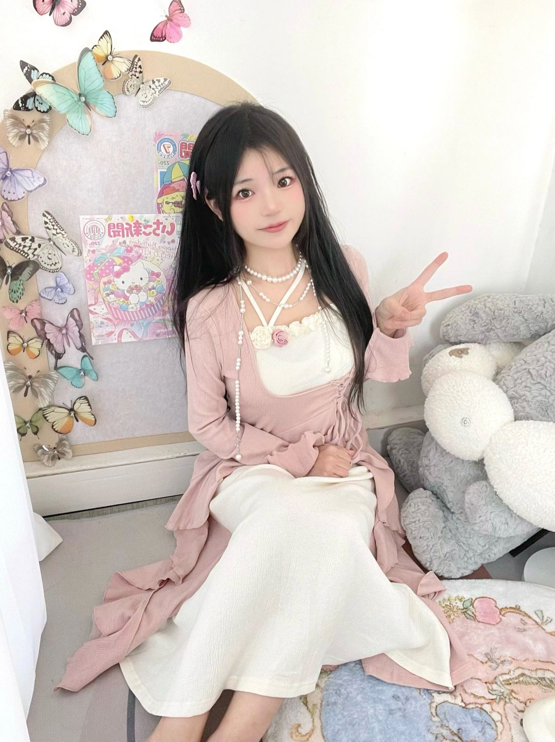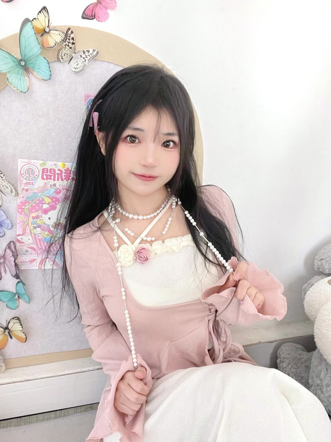 太喜欢粉色啦!粉色连衣裙搭配珍珠项链好温柔呀