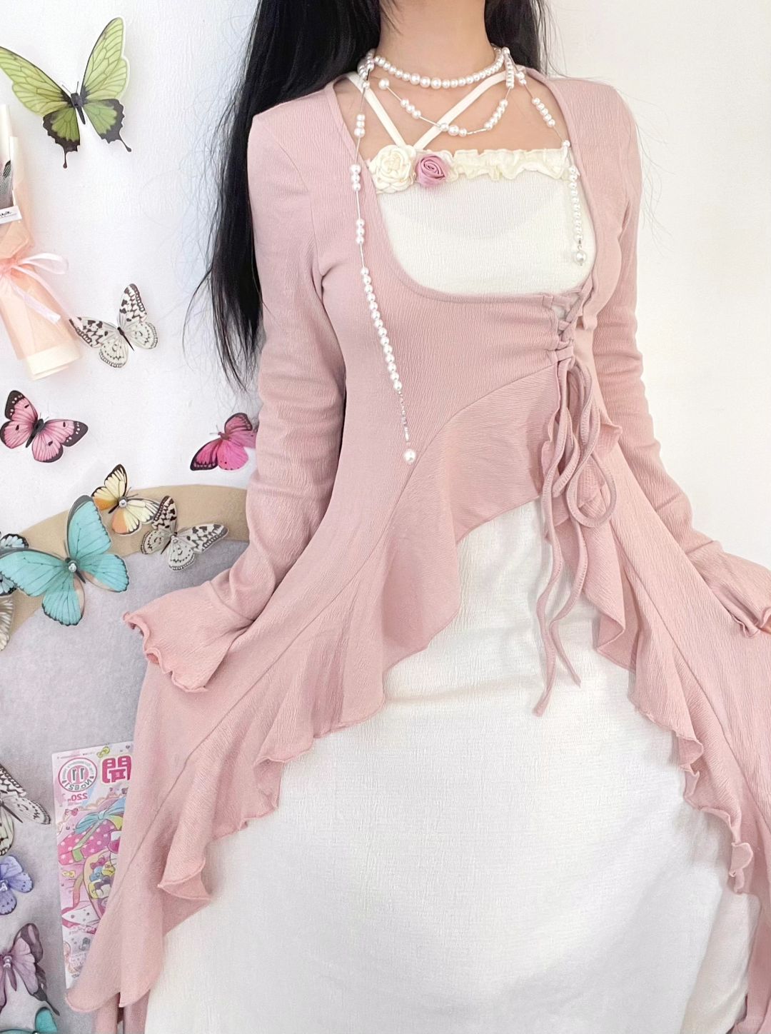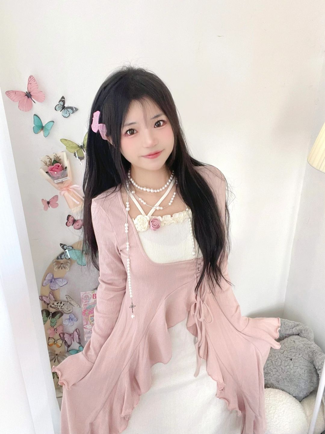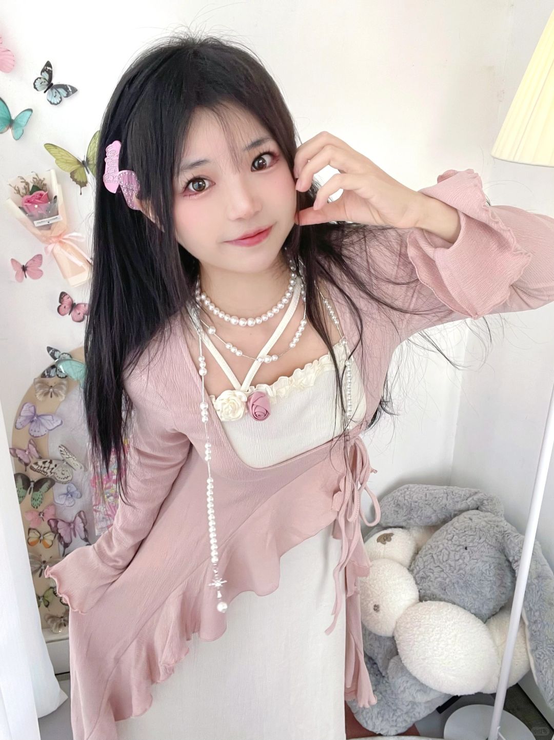 太喜欢粉色啦!粉色连衣裙搭配珍珠项链好温柔呀