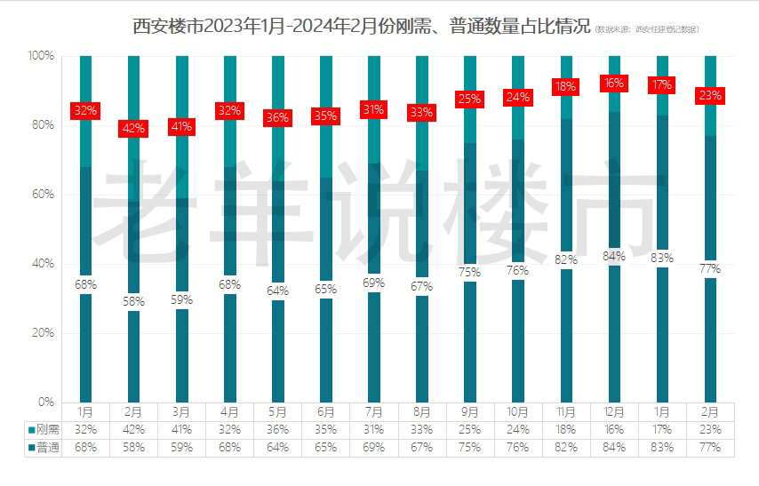 从历月登记情况看刚需比例锐减,这与供应有关,与二手房价格下跌也脱不了关系,显然西安二手房的下跌已经对新房市场产生严重冲击。