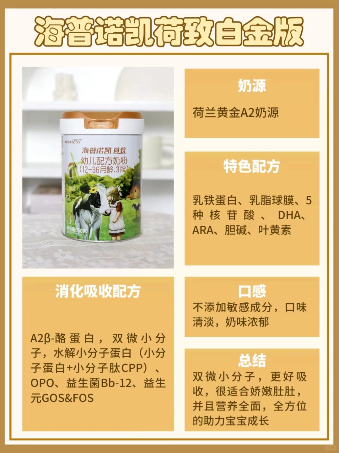 总结:👉爱他美卓傲和美素佳儿源悦,感觉配方还是偏基础,适合肚肚本身就健康的宝宝喝👉海普诺凯荷致荷致白金:它的营养全面,还有双微小分子(水解小分子蛋白+小分子肽CPP),帮助宝宝更好吸收,还被科研实证过更好消化吸收,很适合娇嫩小肚肚,并且想要全方位成长的宝宝。