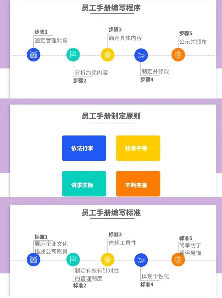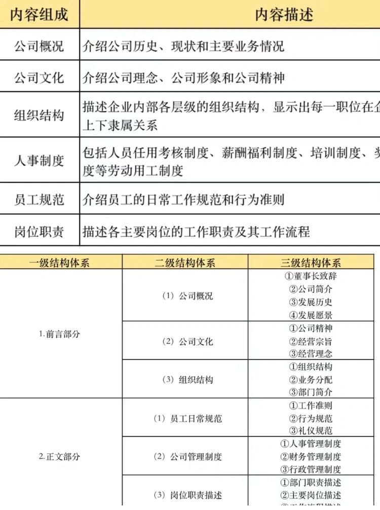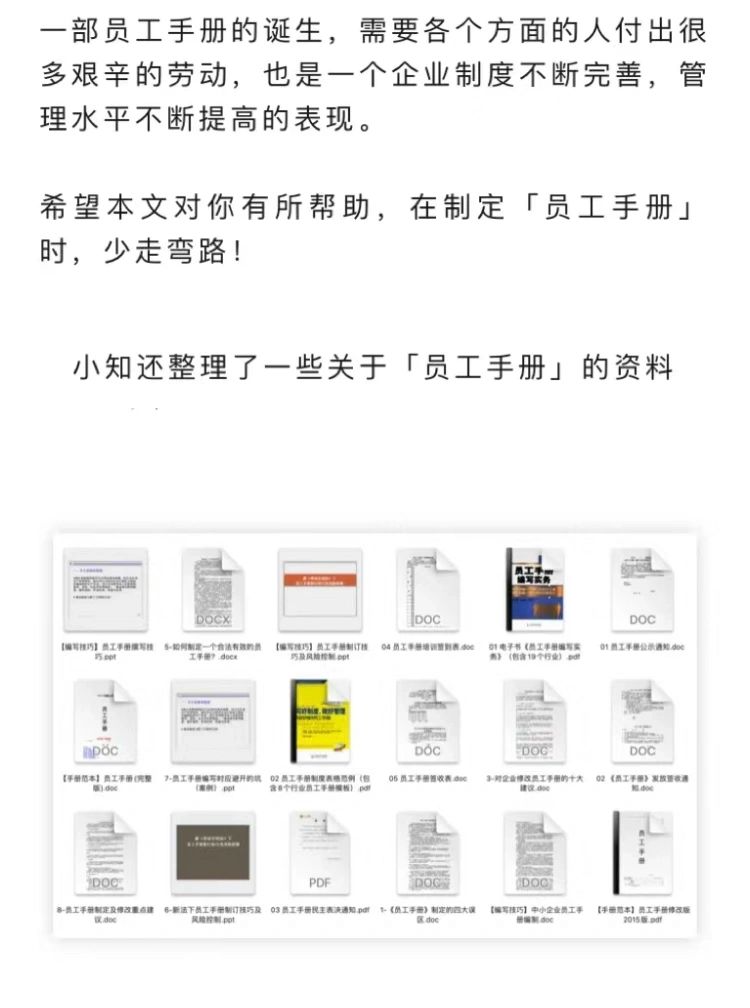 员工手册是企业规章制度、企业文化与企业战略的浓缩,是企业内的「法律法规」。 不仅可以帮助员工快速了解公司的历史、文化、运作模式、员工管理政策、日常行为规范等,助其快速成长;还可以规范员工的日常行为,强化公司要求,提升公司整体的运作效率。