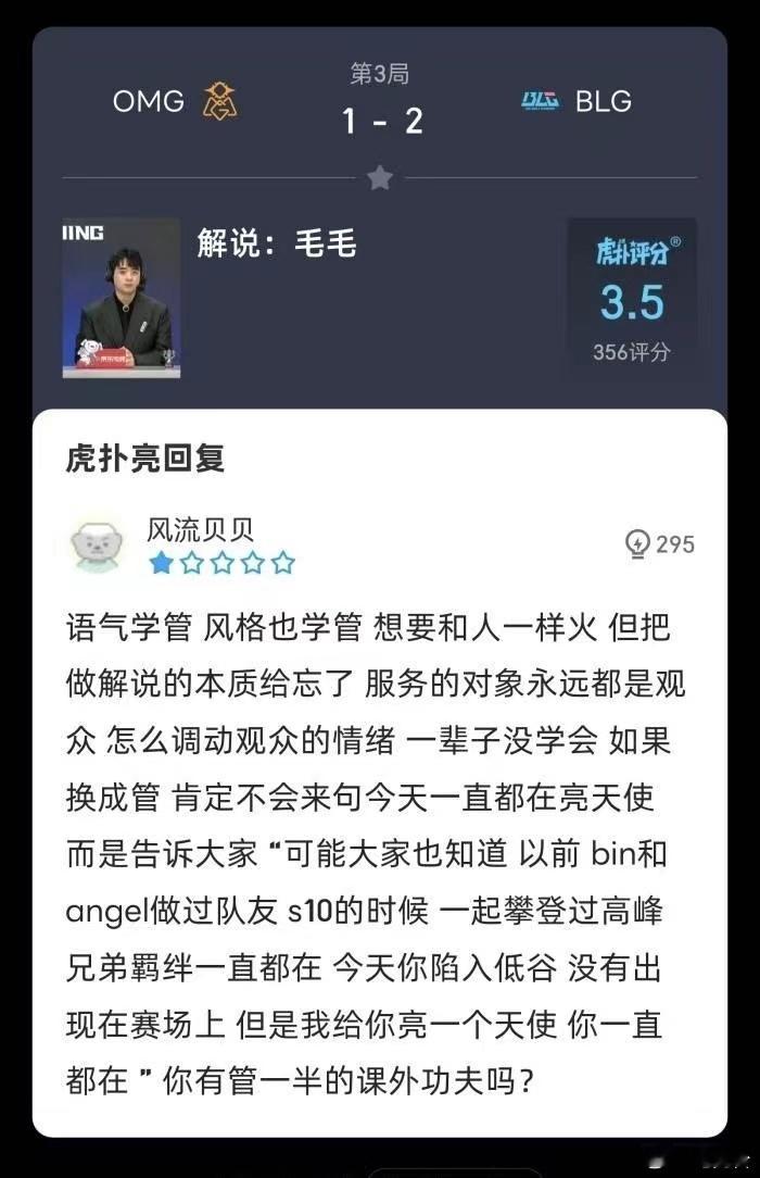 Blg全队BP亮天使是致敬宽慰Angel的时候,毛毛解说的时候没提这点被骂了,然后他解释当时没组织好语言不知道怎么说所以没提。