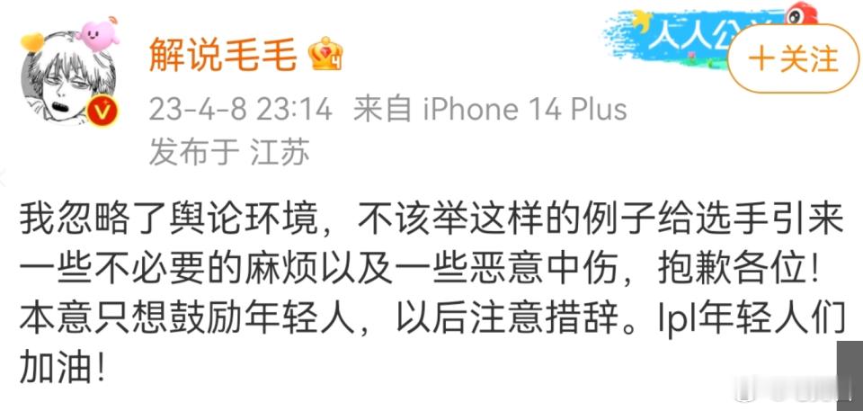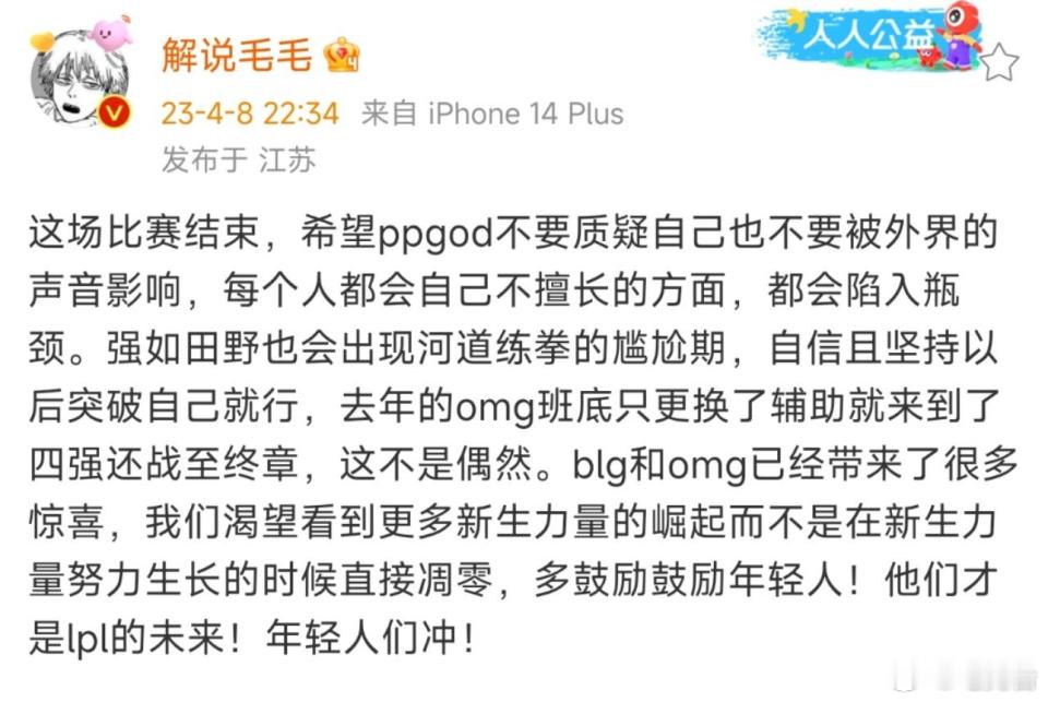 在此之前解说毛毛的个人微博也被冲过,LPL春季赛季后赛败者组BLG和OMG的BO5打完之后,OMG这边第五局因为下路的失误,痛失好局,在下路对线优势领先的时候,辅助ppgod多次出现低级失误,下路优势变劣势,团战期也没有打好,赛后受到了非常多的批评和攻击,而LPL官方解说毛毛在赛后发文鼓励ppgod,结果因为一句话惨遭狂喷爆破,最后不得不删除微博,并且公开道歉。