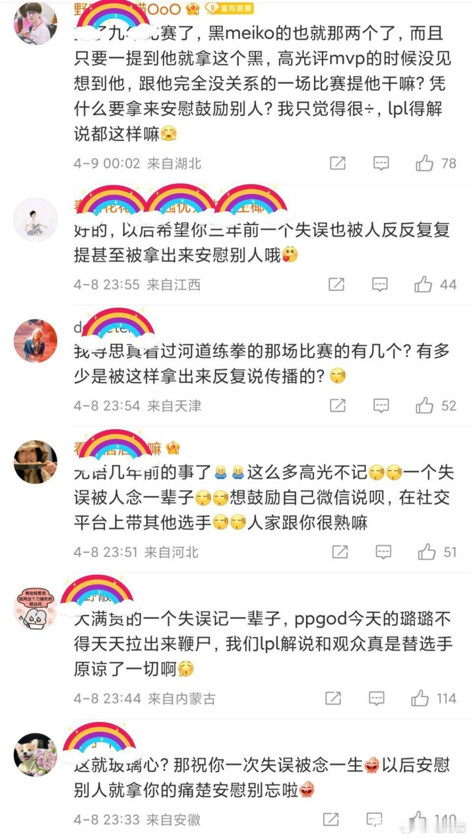 主要是因为他提到了Meiko河道打拳这件事情,引发了不少EDG粉丝的不满。不少人怒斥毛毛:一提到meiko就想到河道打拳,怎么没想到他的高光表现呢?3年前的一个失误被反复提起,甚至拿来安慰别人,这场比赛跟Meiko完全没关系,却被官方解说在社交平台上提及,安慰别人非要用其他人的痛苦吗?