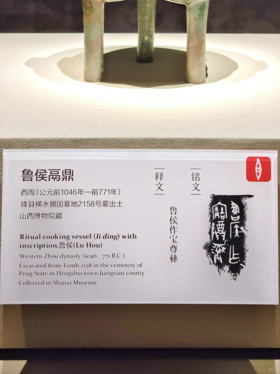 鬲鼎俗称分裆鼎,是鼎与鬲的混合体。上部是鼎的特征,下部是鬲足的特征。鼎和鬲明显的区别在于鬲是胸以下全是腿,而鬲式鼎有些腰身。 这件分裆柱足鼎。带盖,盖面微隆,顶部有桥形钮,两侧有长方形缺口以纳鼎耳。鼎身为桃形口,折沿,方唇,立耳外撇,袋状三分裆,腹较浅,三瘦高柱足。盖面饰两周凸弦纹,鼎身上腹饰一周浮雕蝉纹,采用横向、无地纹构图,纹饰风格较为罕见。盖内和腹内壁均有铭文2行6字:“鲁侯作宝尊彝”。这是目前仅见的西周鲁侯器。现藏