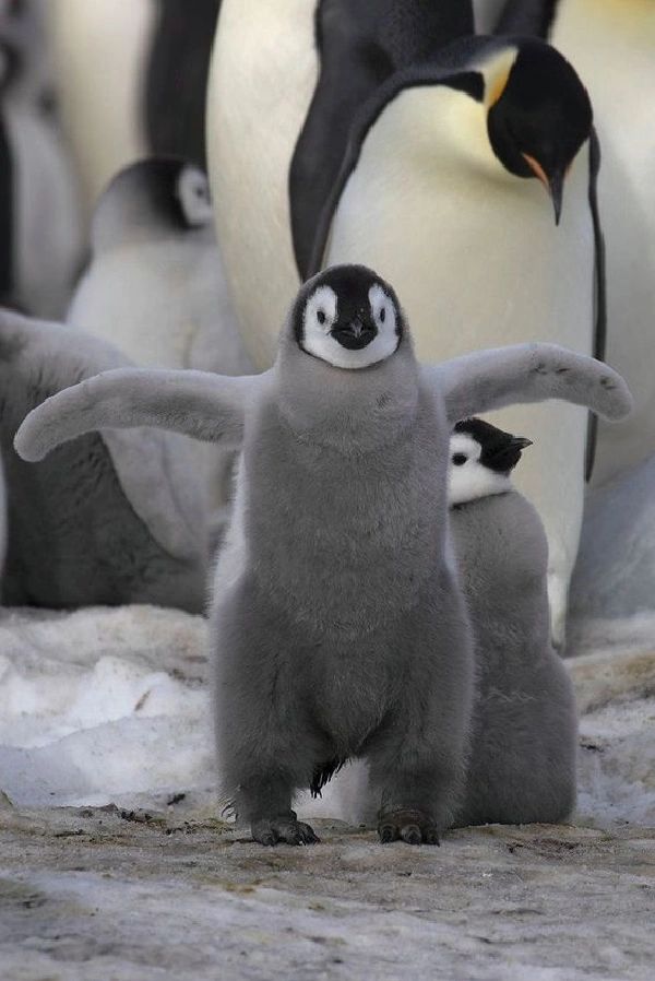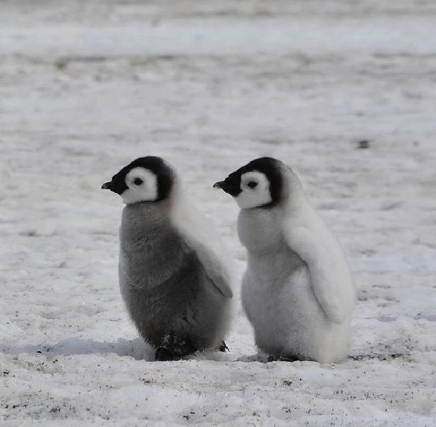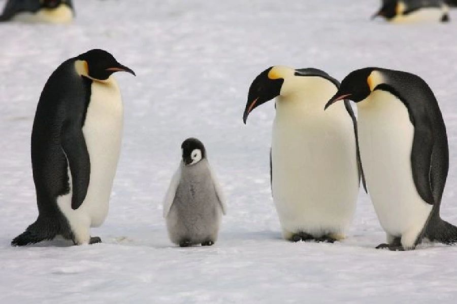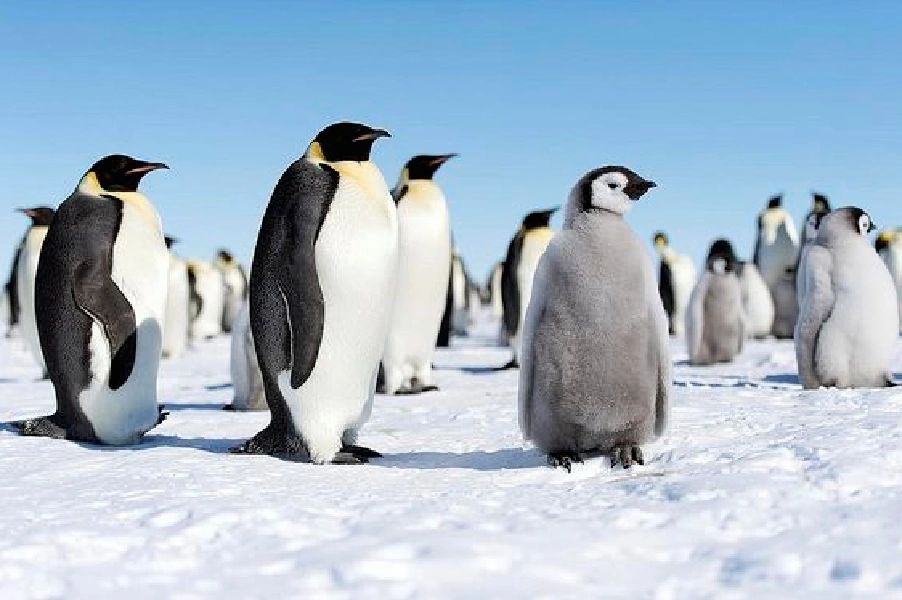 🍀形态特征:成年帝企鹅高达100-130厘米,重达20-45千克,是体型最大的企鹅。帝企鹅身披黑白分明的大礼服,喙赤橙色,脖子底下有一片橙黄色羽毛,向下逐渐变淡,耳朵后部最深,全身色泽协调。颈部为淡黄色,耳朵的羽毛为鲜黄桔色,腹部乳白色,背部及鳍状肢则是黑色,鸟喙的下方是鲜桔色。雄皇帝企鹅双腿和腹部下方之间有一块布满血管的紫色皮肤的育儿袋,能让蛋在环境温度低达零下40℃的低温中保持在舒适的36℃。小帝企鹅身上的浅灰白色绒羽可御寒防风,但不防水,防水的陵羽要等到它们快成年时才会长出,慢慢替换身上的绒羽,身体下方的绒羽会先掉。