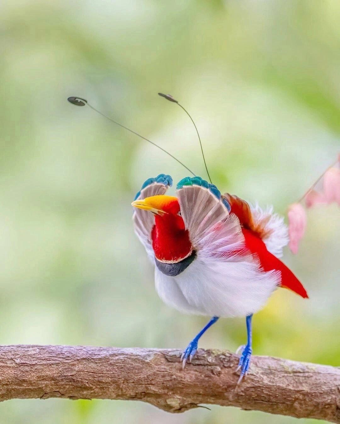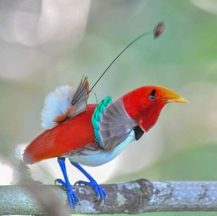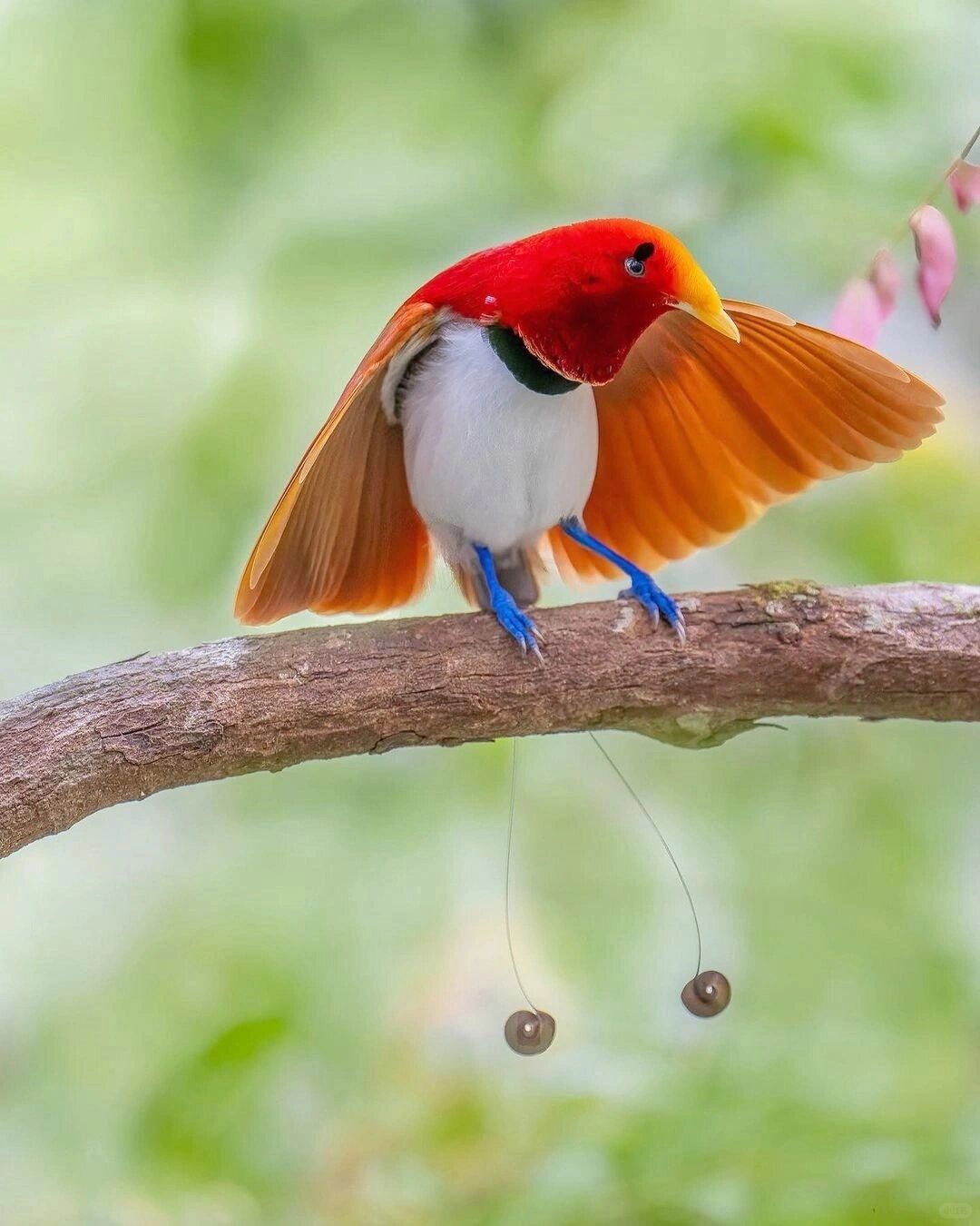 🍀形态特征:王极乐鸟被誉为“活宝石”,是极乐鸟中最小的物种,其色彩鲜艳、独特。雄性王极乐鸟的背部呈绯红色,胸腹雪白,脚部亮蓝色,嘴部呈鹅黄色。雌性王极乐鸟的外观较为朴素,身体呈棕色,下部有条纹。雄鸟的尾部有两只与身体等长的球拍状饰羽。