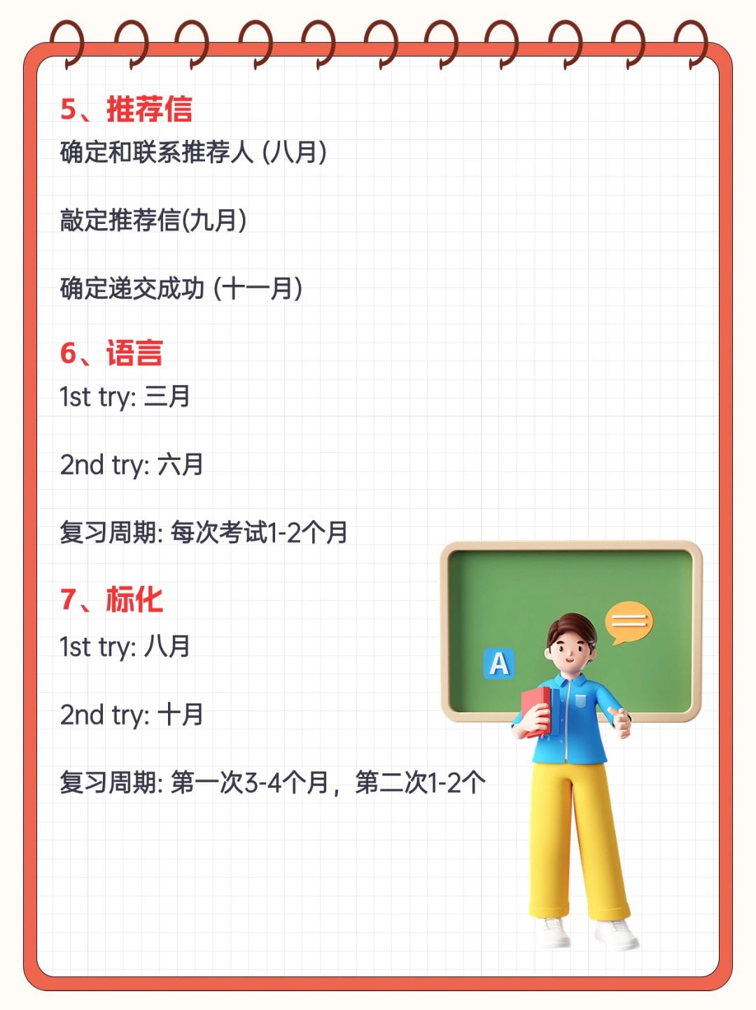 这份时间线综合考虑了整个申请过程的各个环节,确保有足够的时间来准备,提高成功申请的机会。请根据个人情况和申请学校的要求适度调整时间安排。祝你成功!