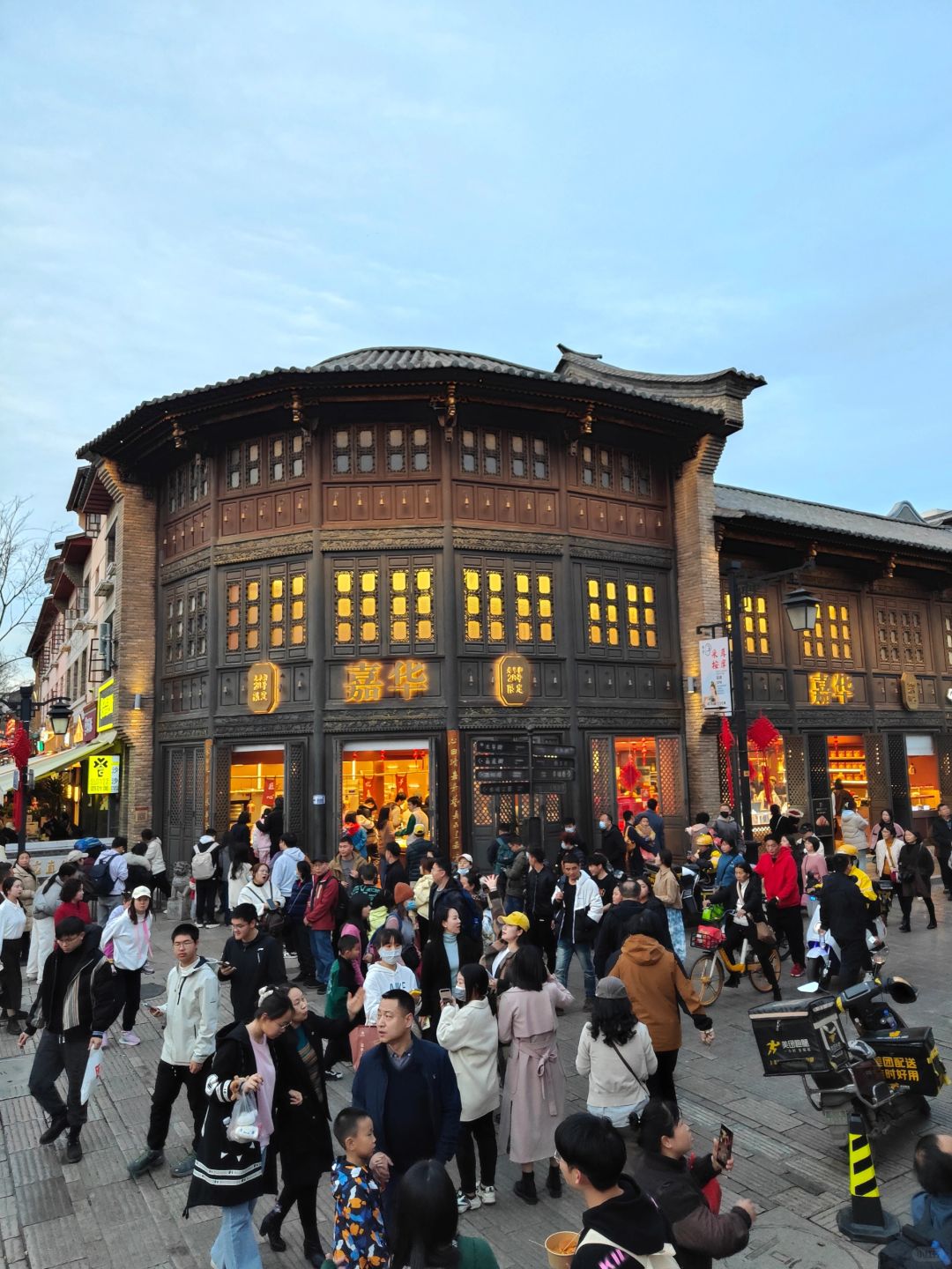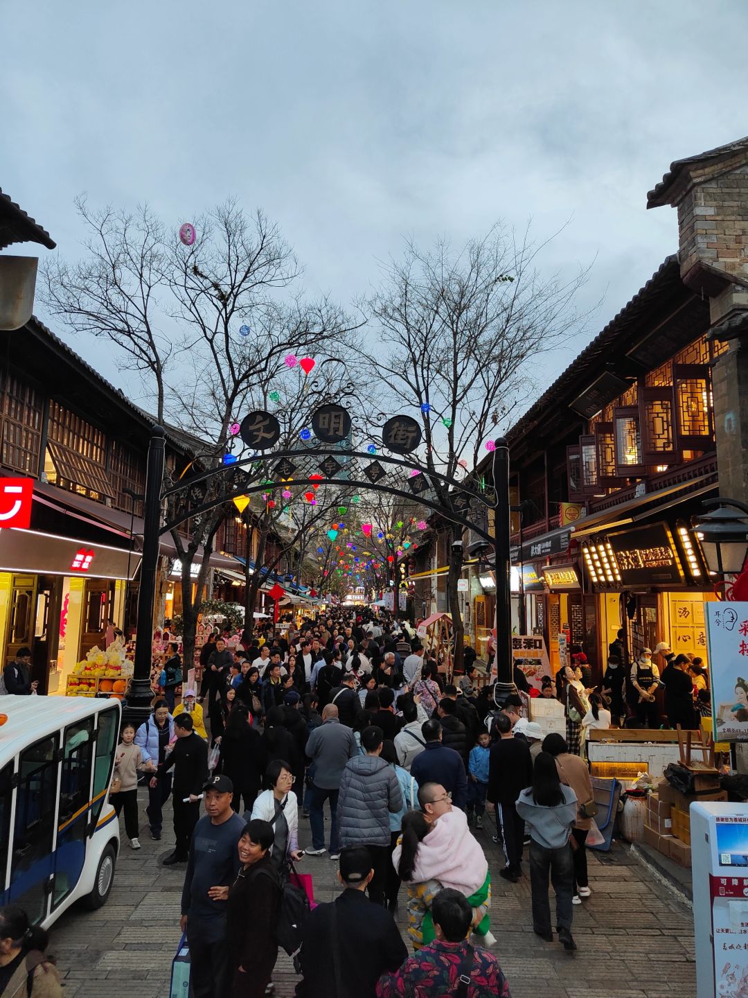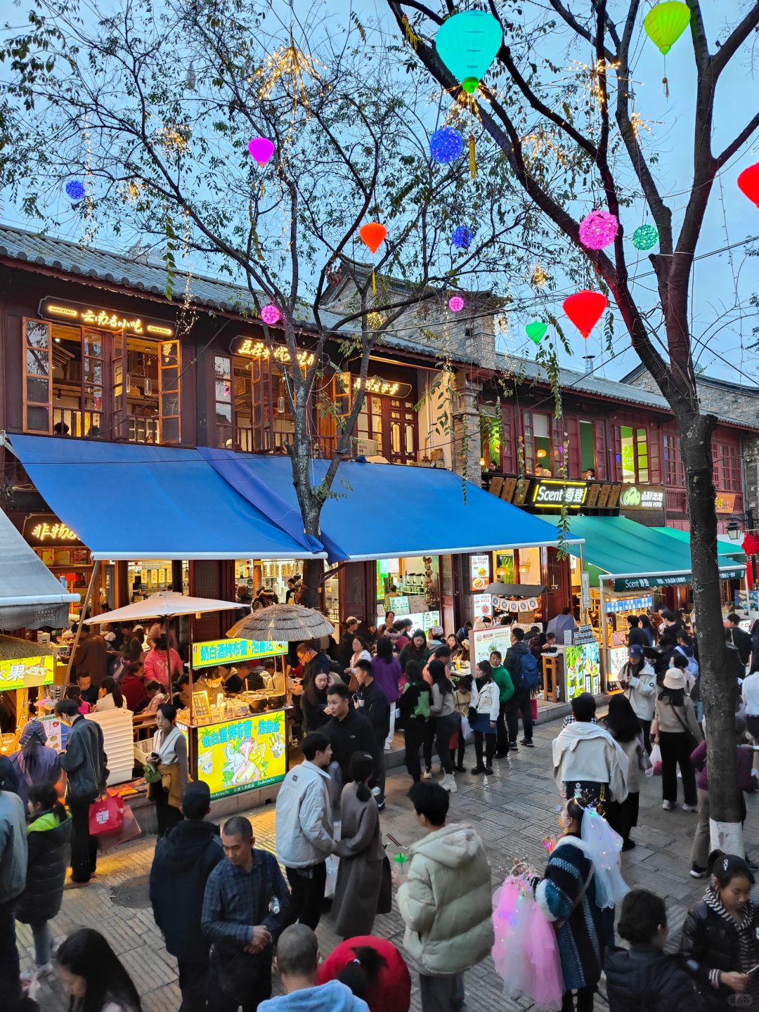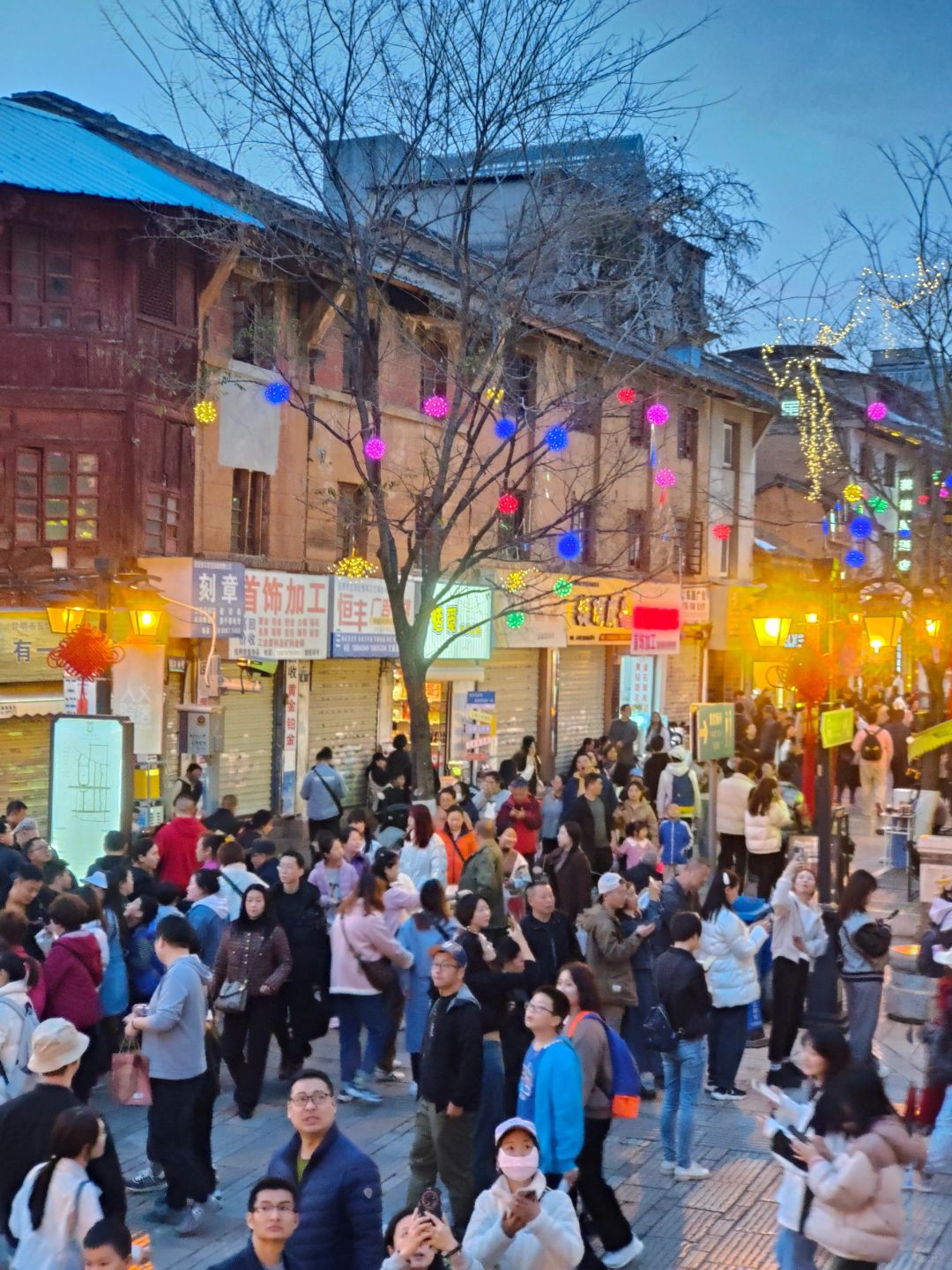 已经是大年初五, 昆明老街下午开始就变得人潮汹涌, 夜幕降临,灯亮起来, 古街变得迷人可爱, 接下来整条街也是人山人海。 老街进入一天的高峰期。 [庆祝R][庆祝R] 正常餐厅排队一个半小时才能吃上饭, 因为很多小吃都是挤满人排队的, [庆祝R][庆祝R] 来这里气氛是足够好了, 排队情况要有心理准备了。